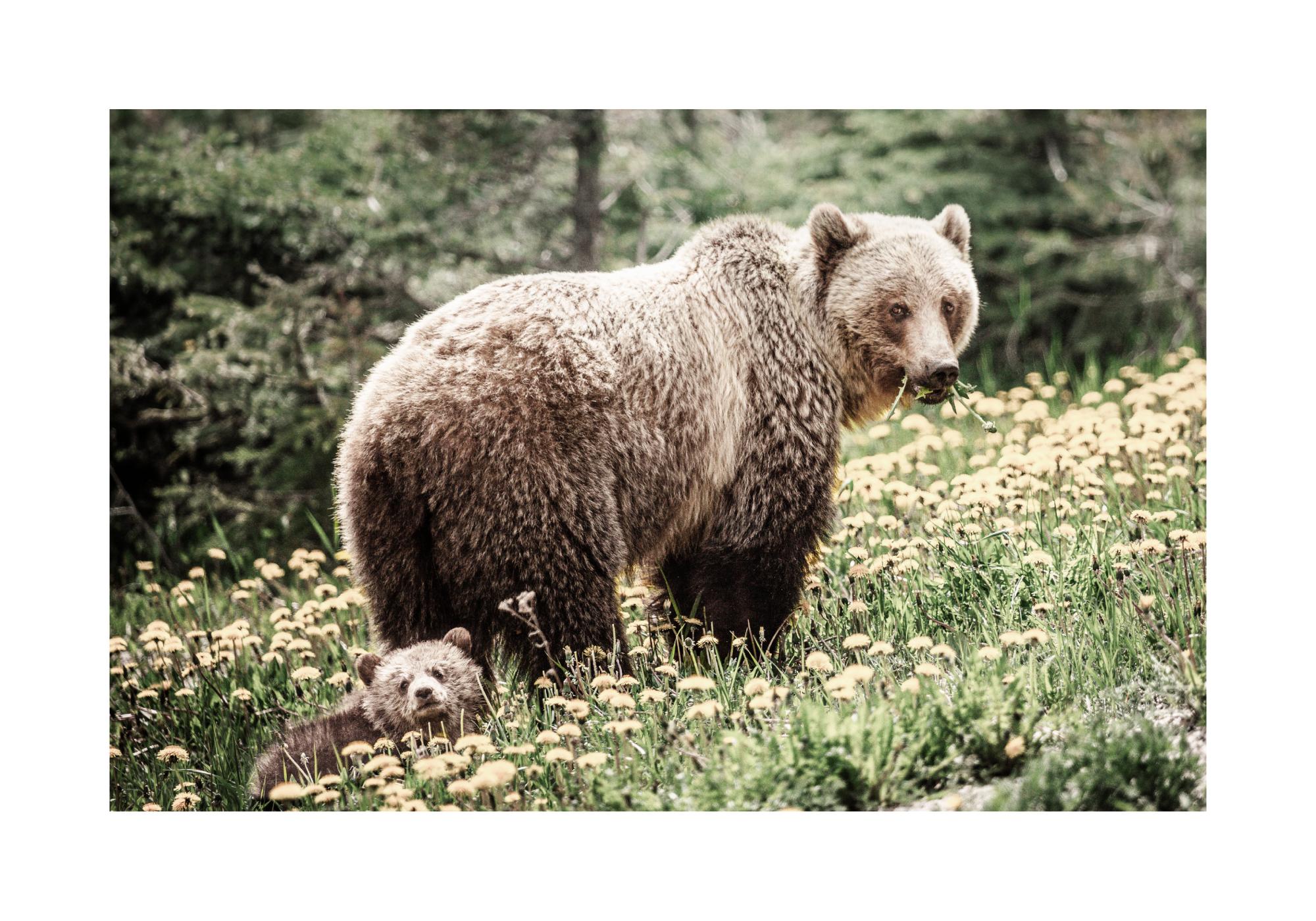 From $31A cute animal poster of a small bear family on a dandelion meadow. The mother bear and the baby bear look curiously into the camera and the little bear baby is just big enough to look over the grass. This nature poster looks as good in the living room as it does in the children's room.