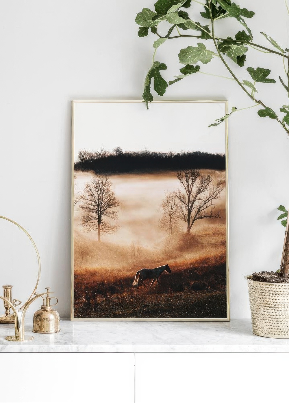 Beautiful photographic poster of a horse strolling along an open field at dawn. The field is slightly covered by a thick layer of fog creating a beautiful contrast with the earthy colours. The poster's high contrast creates a beautiful illusion of completely black trees in the background. A great interior design tip is to frame the poster in a black metal frame to make it look extra stylish.