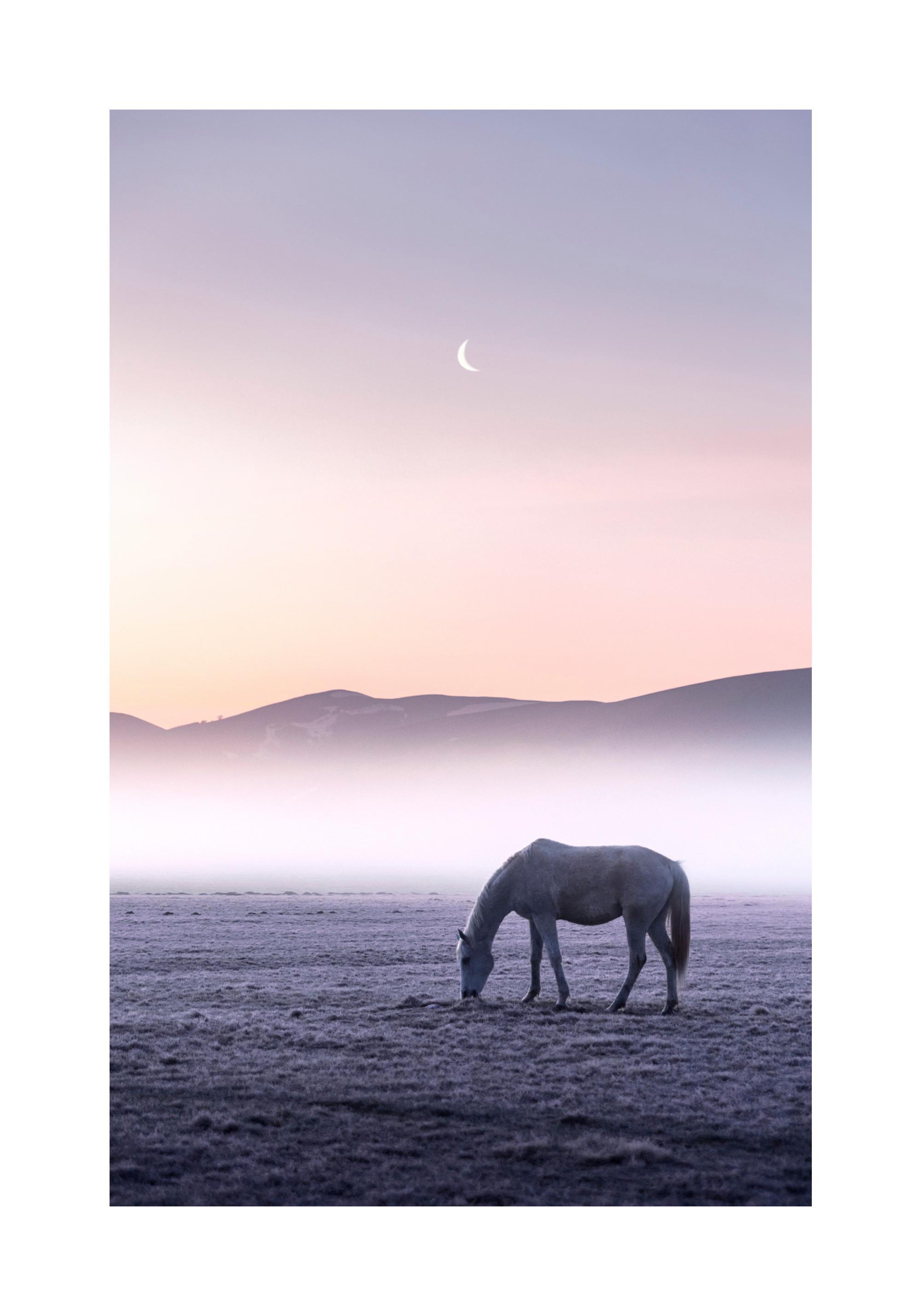 From $31A dreamlike animal poster of a horse in moonlight with mist in the background. The horse stands peacefully in a meadow and is surrounded by the purple sky and the setting sun. This nature print is perfect for all people who love moonlight and the fascinating night sky.