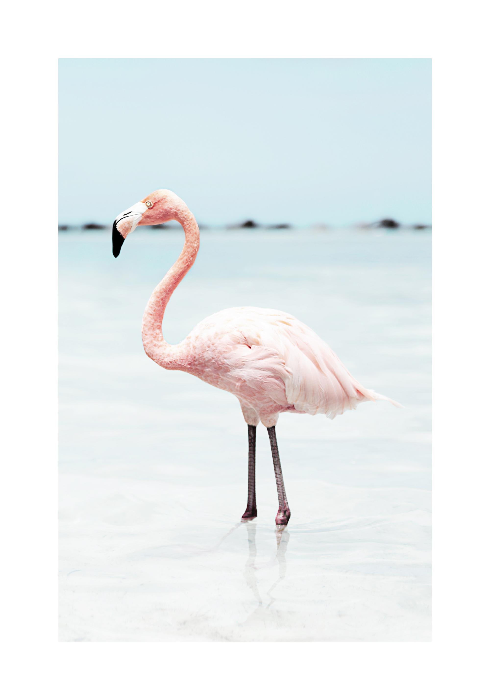 A trendy photographic poster of a pink flamingo in the water on a sunny day. Did you know that the feathers of flamingos are not pink by nature, but only because they eat so many pink crabs?