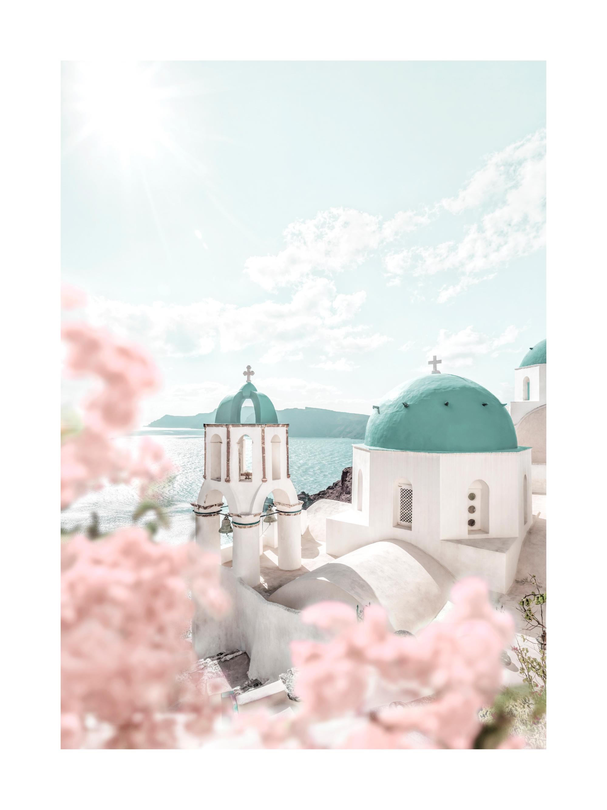 From $21.70A gorgeous photo poster that looks out past blooming pink blossoms over the Greek village of Oia, Santorini. Greece, with its charming neoclassical buildings, narrow cobbled streets, whitewashed houses, and cute turquoise-topped chapels, is infused with romance and tranquility. This dreamy island poster is a perfect eye-catcher for your beautiful gallery wall.