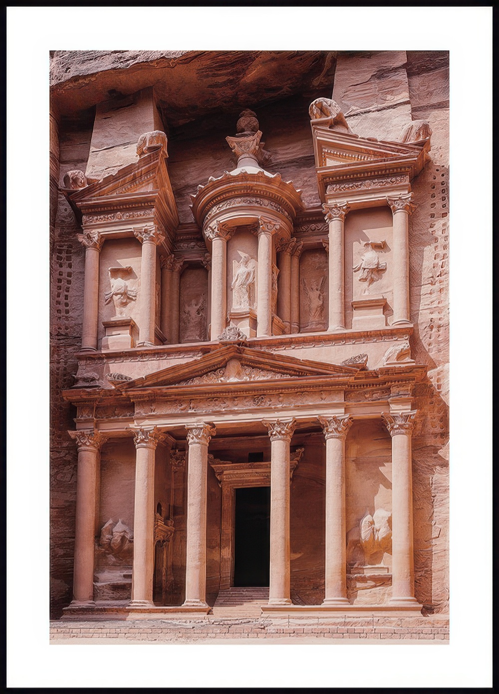 Stunning architecture poster of Al Khazneh in the historical and archaeological city Petra (Raqmu), Jordan. Al Khazneh, also known as The Treasury, is a temple made out of sandstone and is believed to be a mausoleum of the Nabatean King Aretas IV in the 1st century AD. The name Treasury derives from the legend that bandits and pirates hid their loot in a stone urn within the temple and many people therefore believed it was filled with treasure. The poster has a printed white margin that frames the design.
