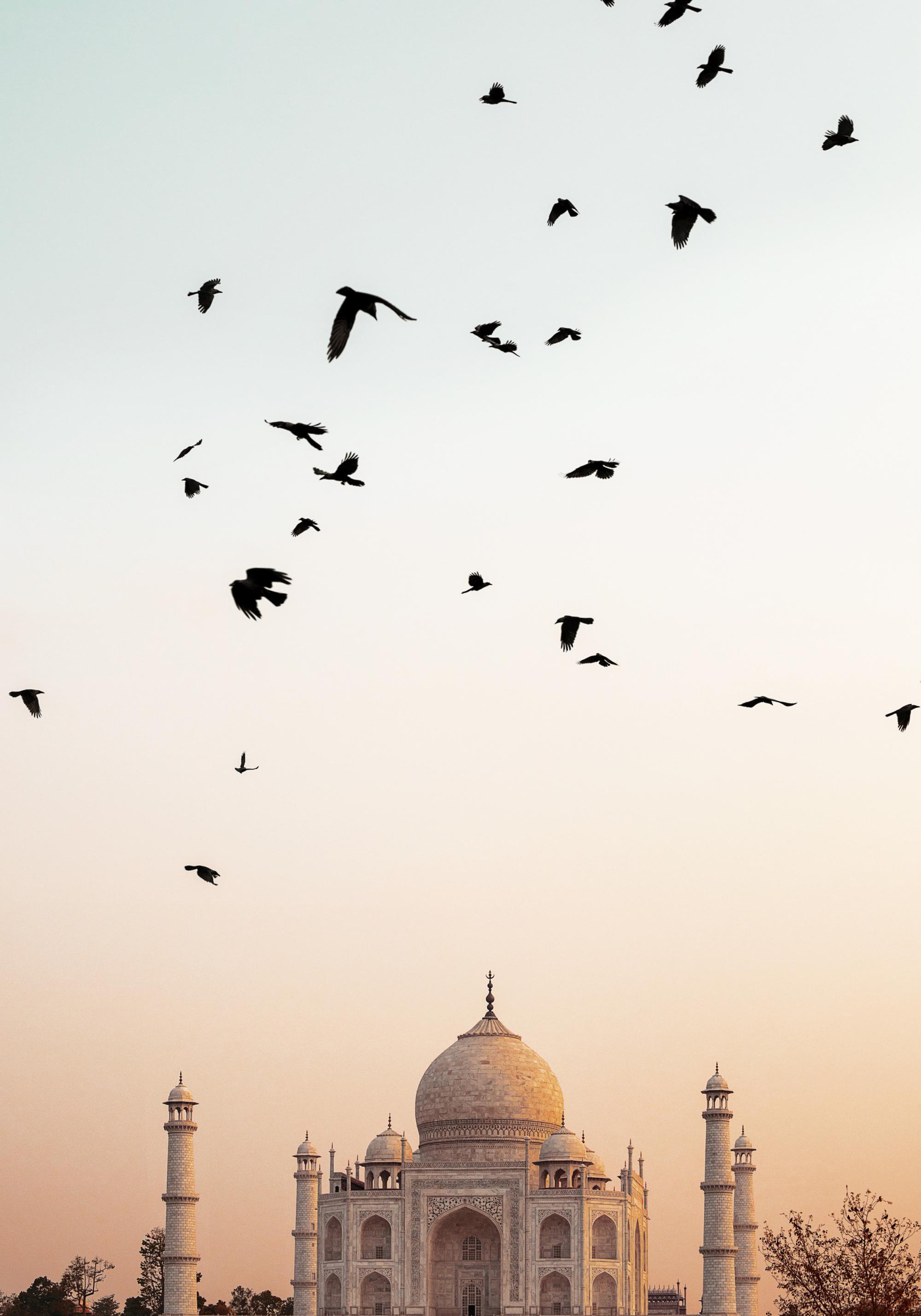 A charming photographic poster of the Indian palace Taj Mahal at sunset. Birds fly over one of the seven wonders of the world in the pink-orange sky, adding romance to the architecture poster. Bring uniqueness and beauty to your living space with this impressive palace.