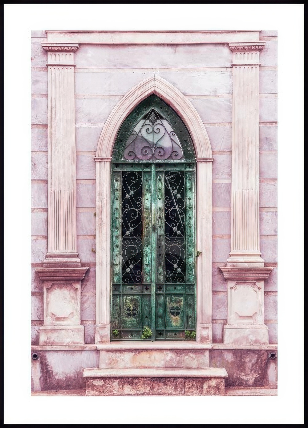 A charming poster in bohemian style with a green blue and light rusty portal that matches nicely with the pink stone wall. The door is placed between two columns leaving making a powerful impression.