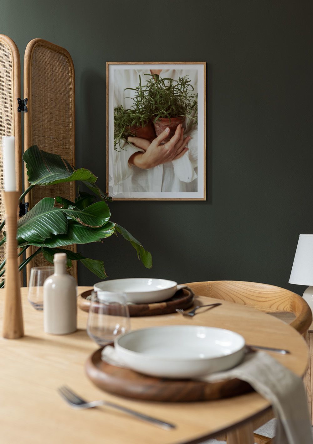From $34.97A print of hands holding two small terracotta pots with fresh green rosemary plants against a light background. Perfect for adding a natural touch to your kitchen.
