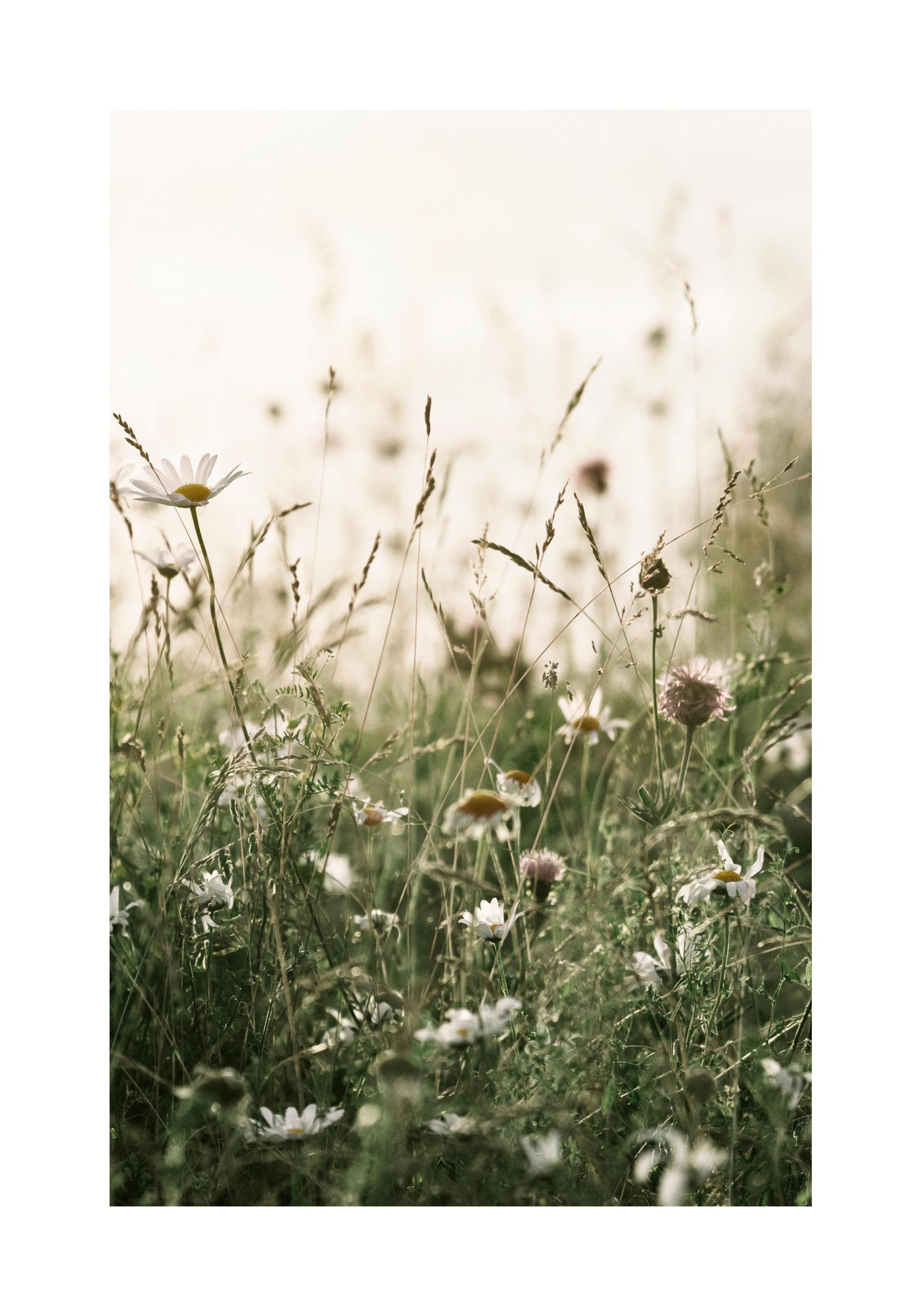 From $31Summery flower poster of pretty white daisies and wild flower buds in tall grass. Marguerites and daisies grow from spring to fall and can be found on meadows, roadsides, grassy areas and fields. The poster has a printed white margin that frames the design.