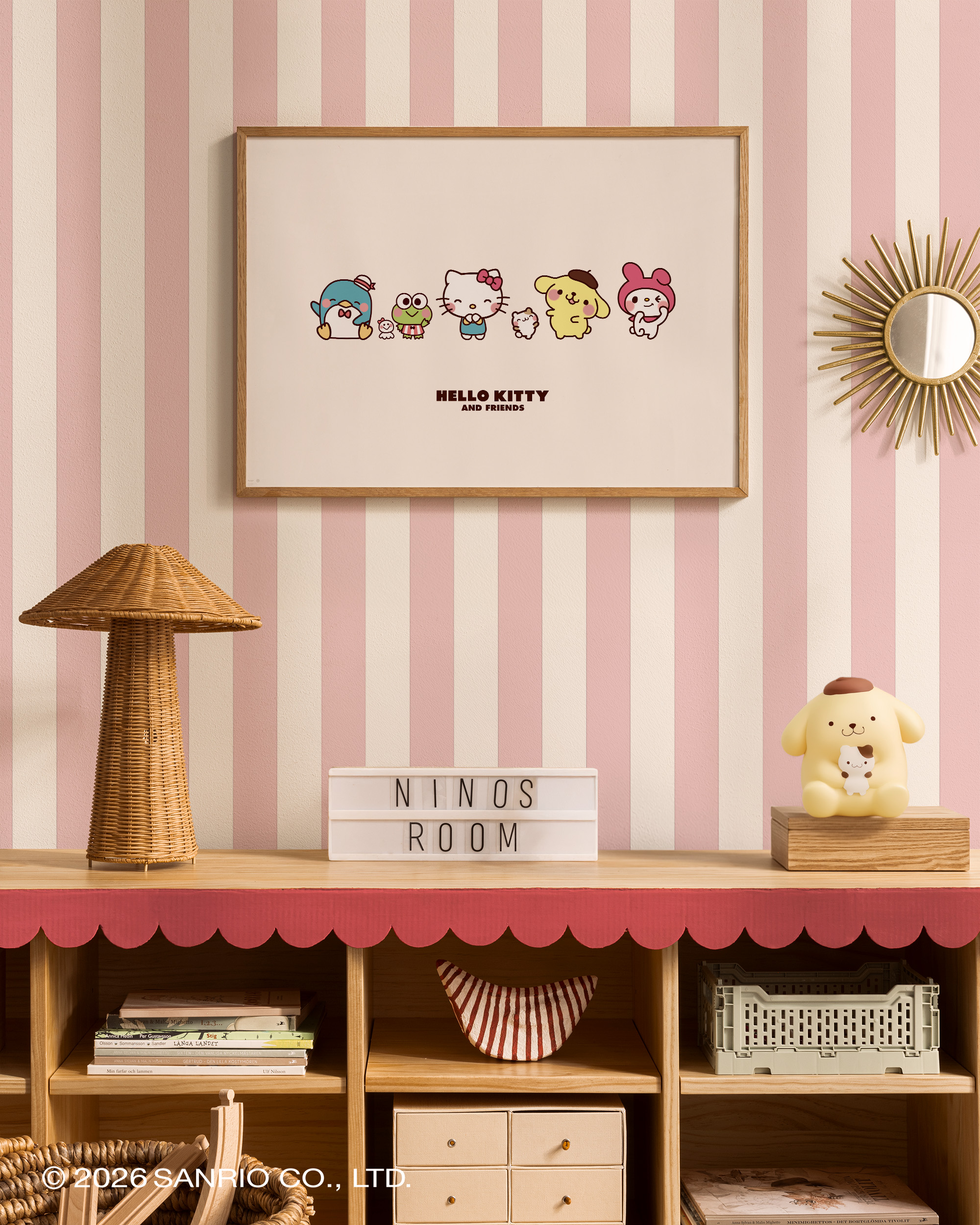Hello Kitty poster featuring adorable baby characters. Perfect print to brighten up a child's bedroom or nursery with cute and colourful illustrations.