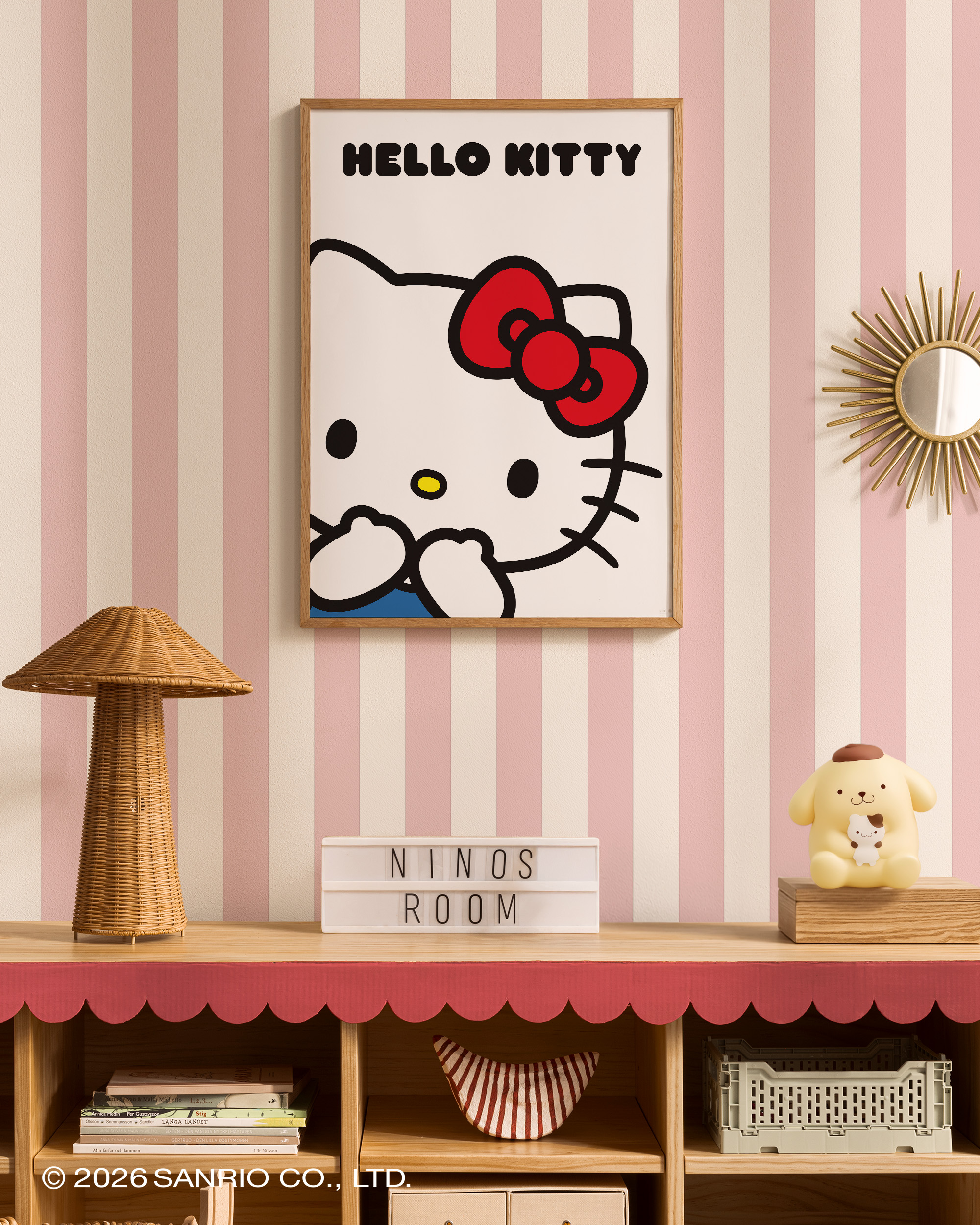 Hello Kitty poster featuring the adorable character giggling. Perfect print to brighten up any child's bedroom or playroom.