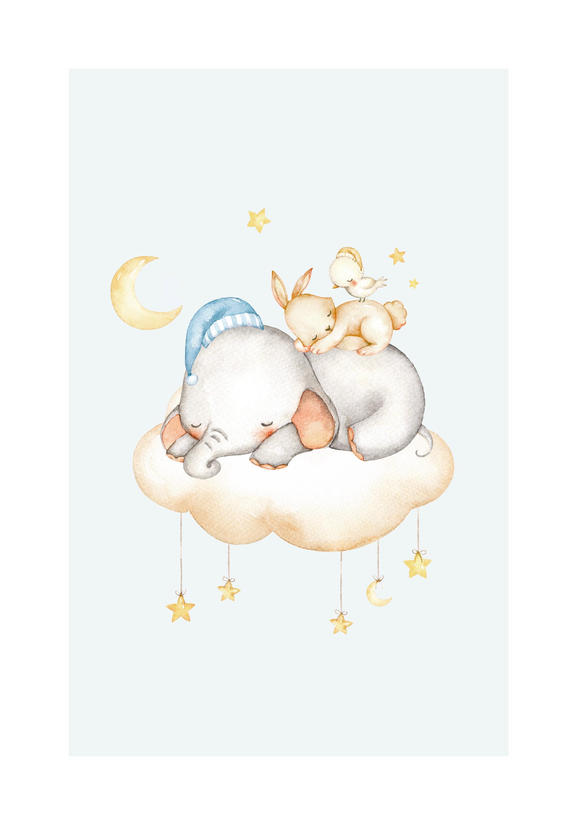 From $31A cute children's print of sleeping friends. A little bird sits on a rabbit, which lies on an elephant and flys on a cloud in the starry sky. This nursery print is sure to make any little adventurer fall fast asleep and ensure sweet dreams.