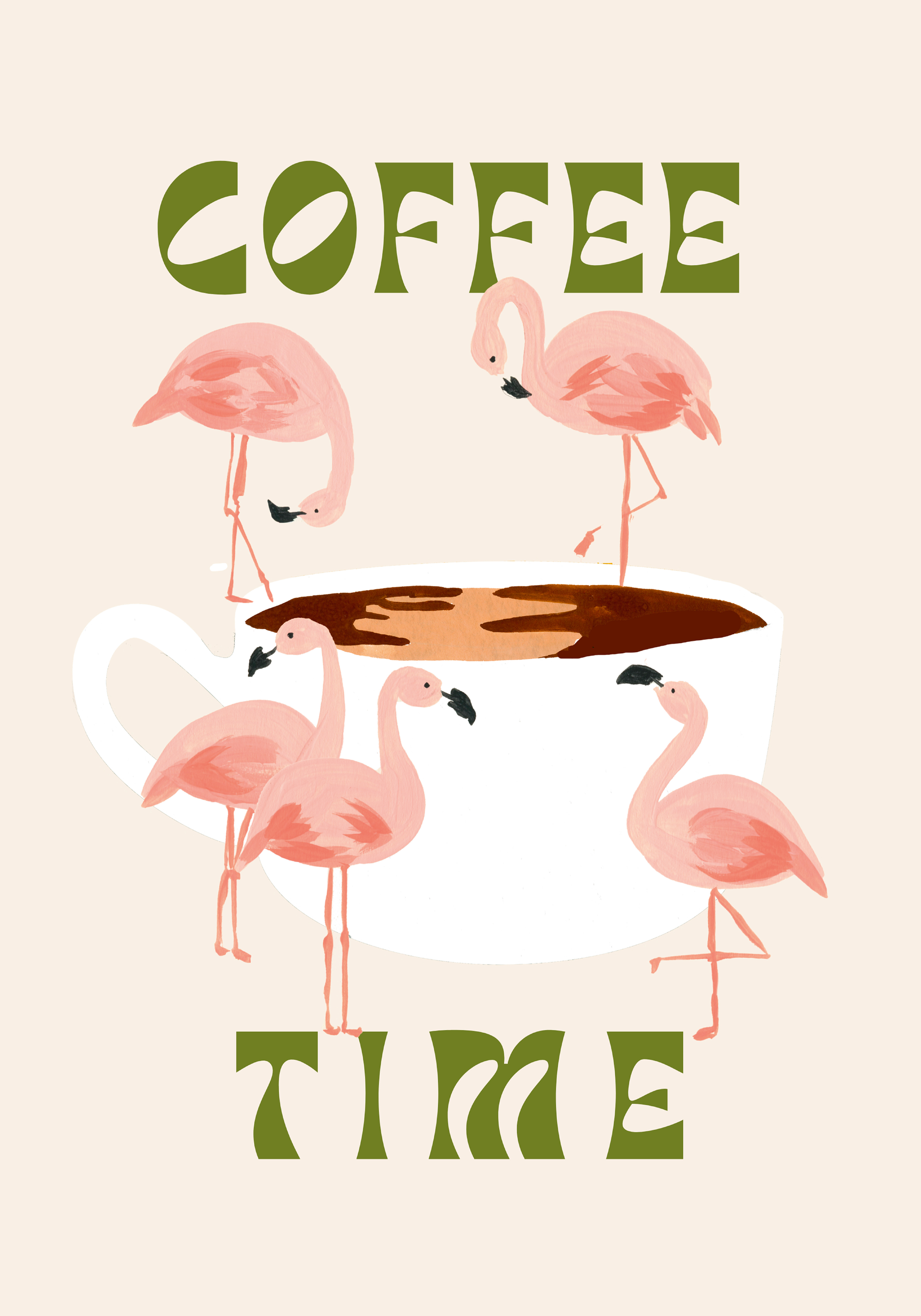 A fun poster featuring five pink flamingos around a large white coffee cup on a light beige background. Perfect wall art for coffee lovers!