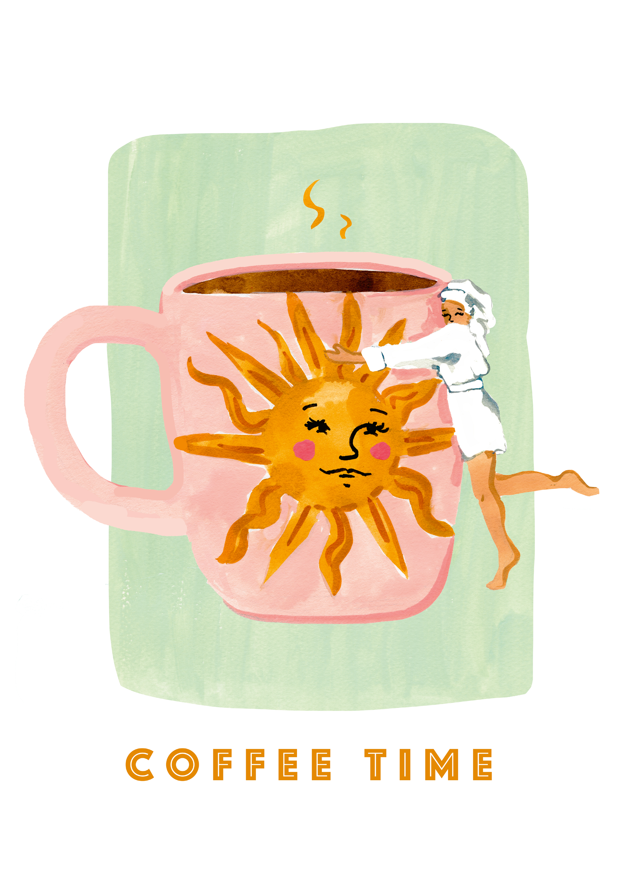 A poster illustrating a pink coffee mug with a smiling sun design and steam rising from it. Perfect wall art to brighten up your kitchen!
