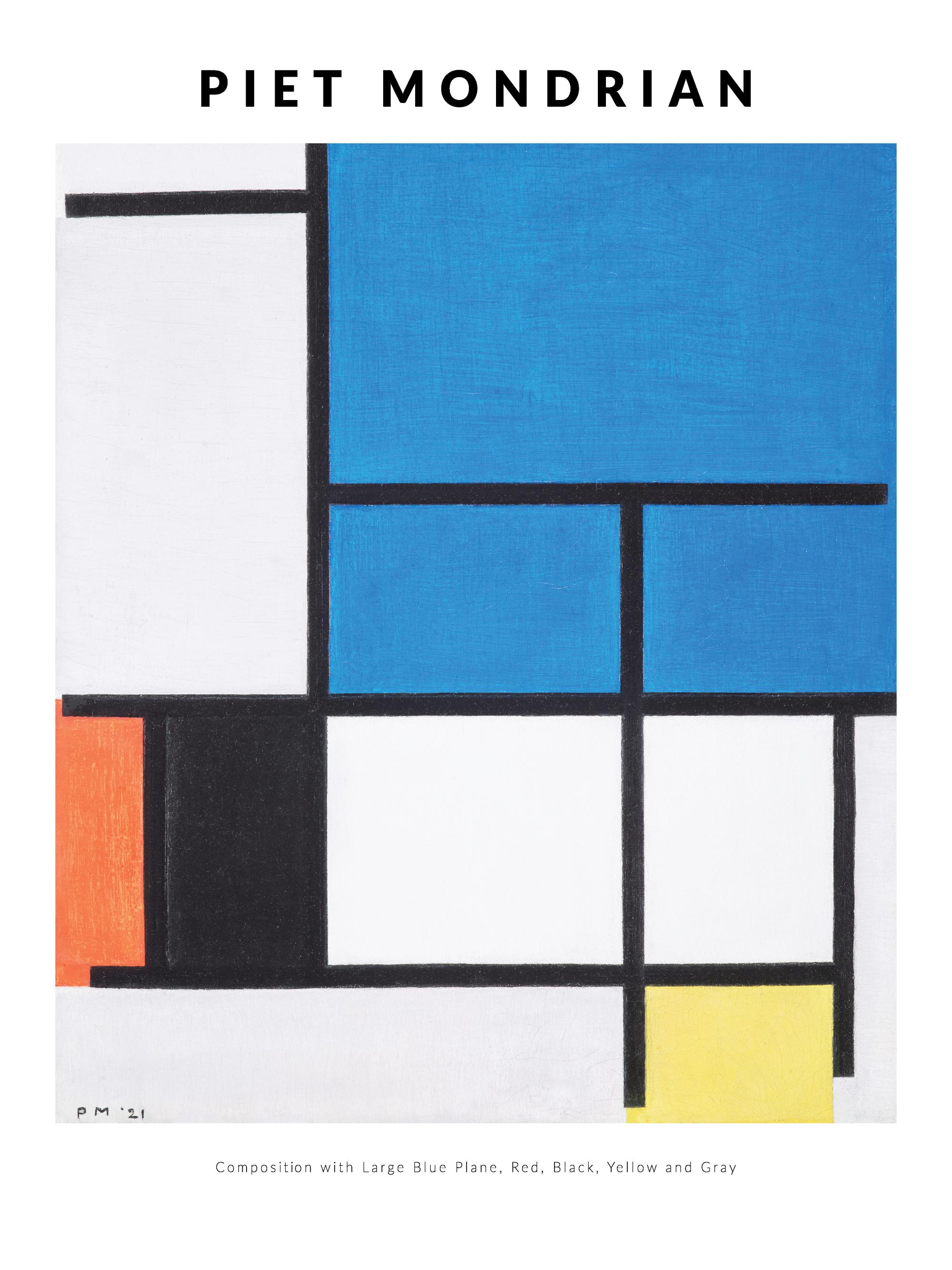 Abstract poster with black lines forming rectangles in blue, red, yellow, black and white. A bold and simple wall art piece in Mondrian's iconic style.