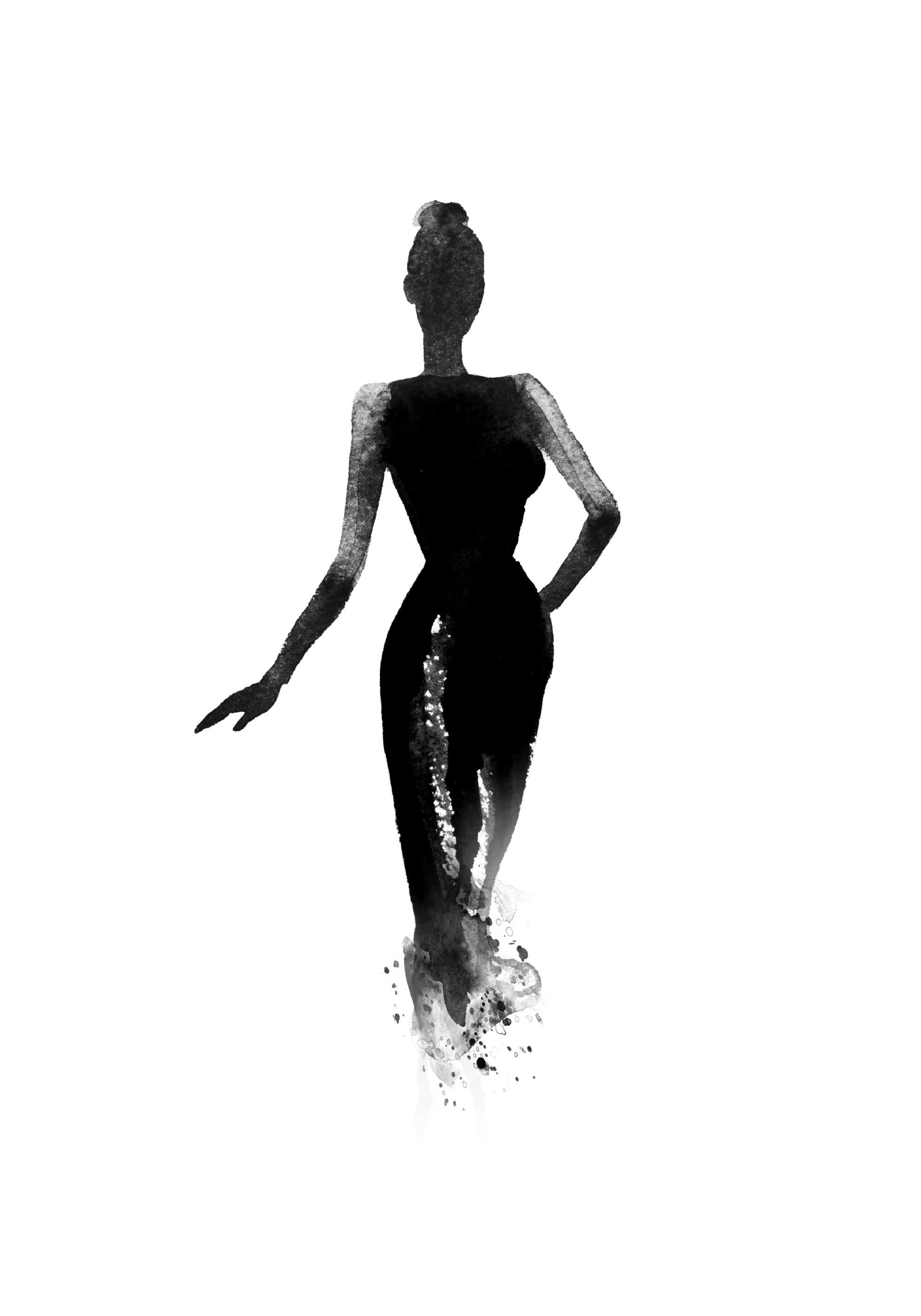 Nice illustrated fashion poster of a woman painted in water colour wearing a black outfit.