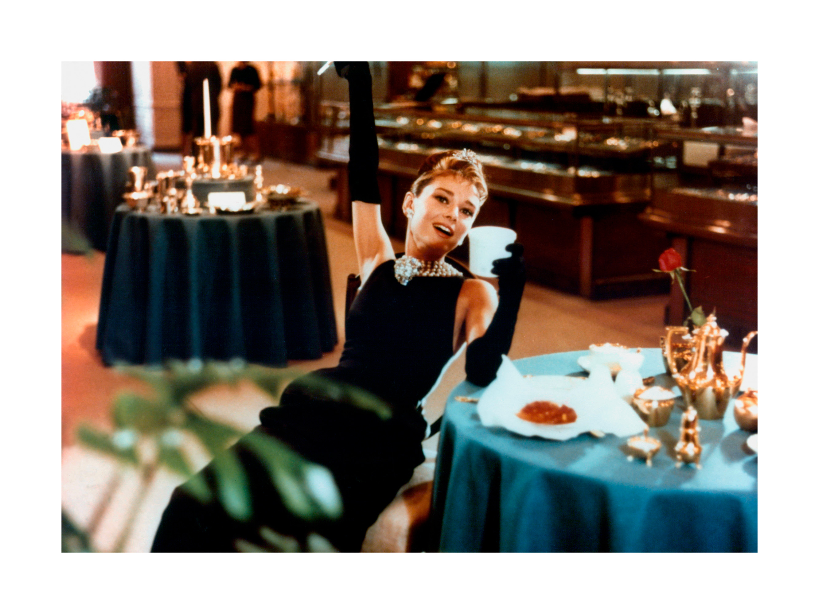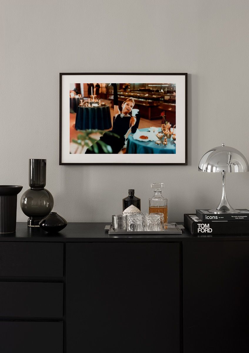A stylish black and white poster featuring the iconic Audrey Hepburn from the classic film Breakfast at Tiffany's.