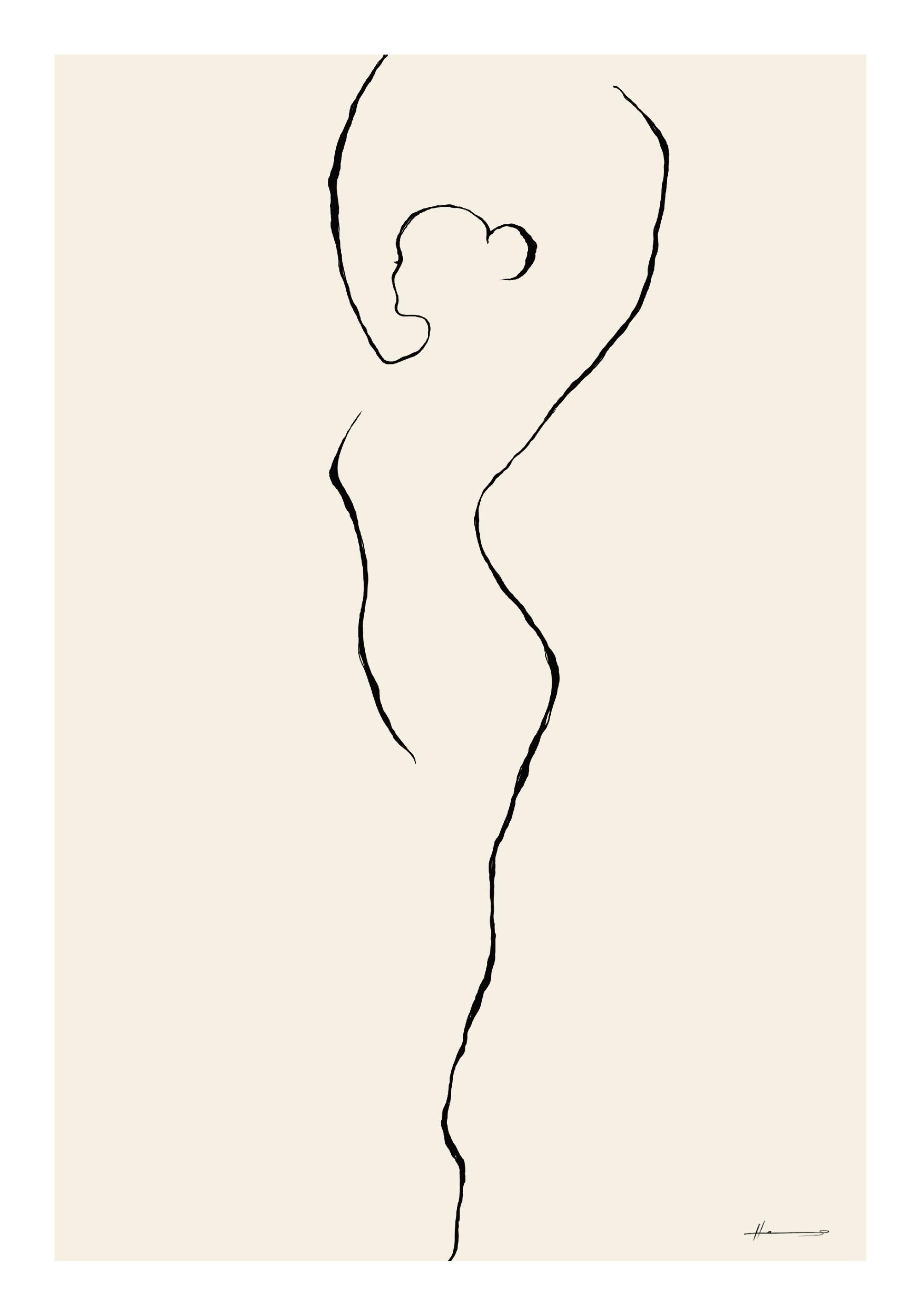From $31A minimalistic art poster of a ballet dancer drawn on a beige background. The line art drawing shows a ballerina standing on one leg and stretching her arms in the air. Bring elegance into your home with this artwork.