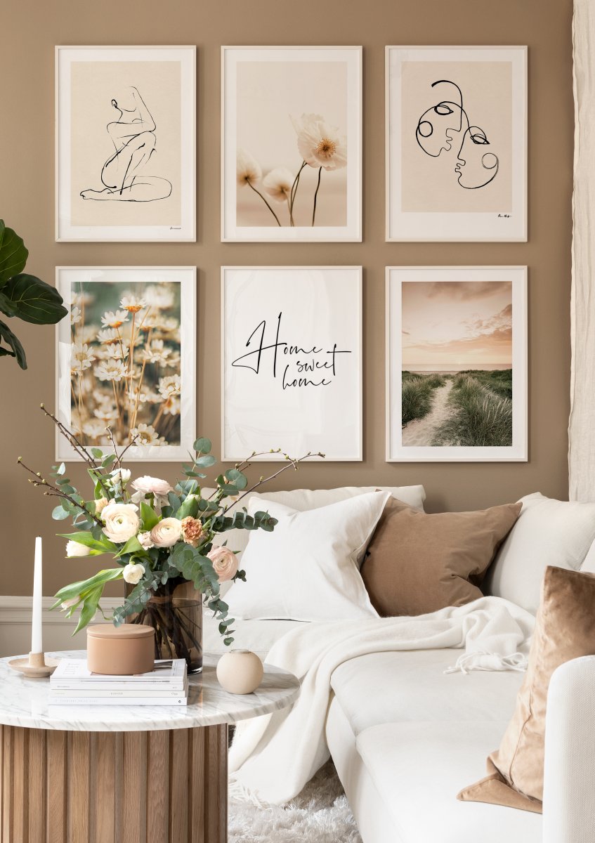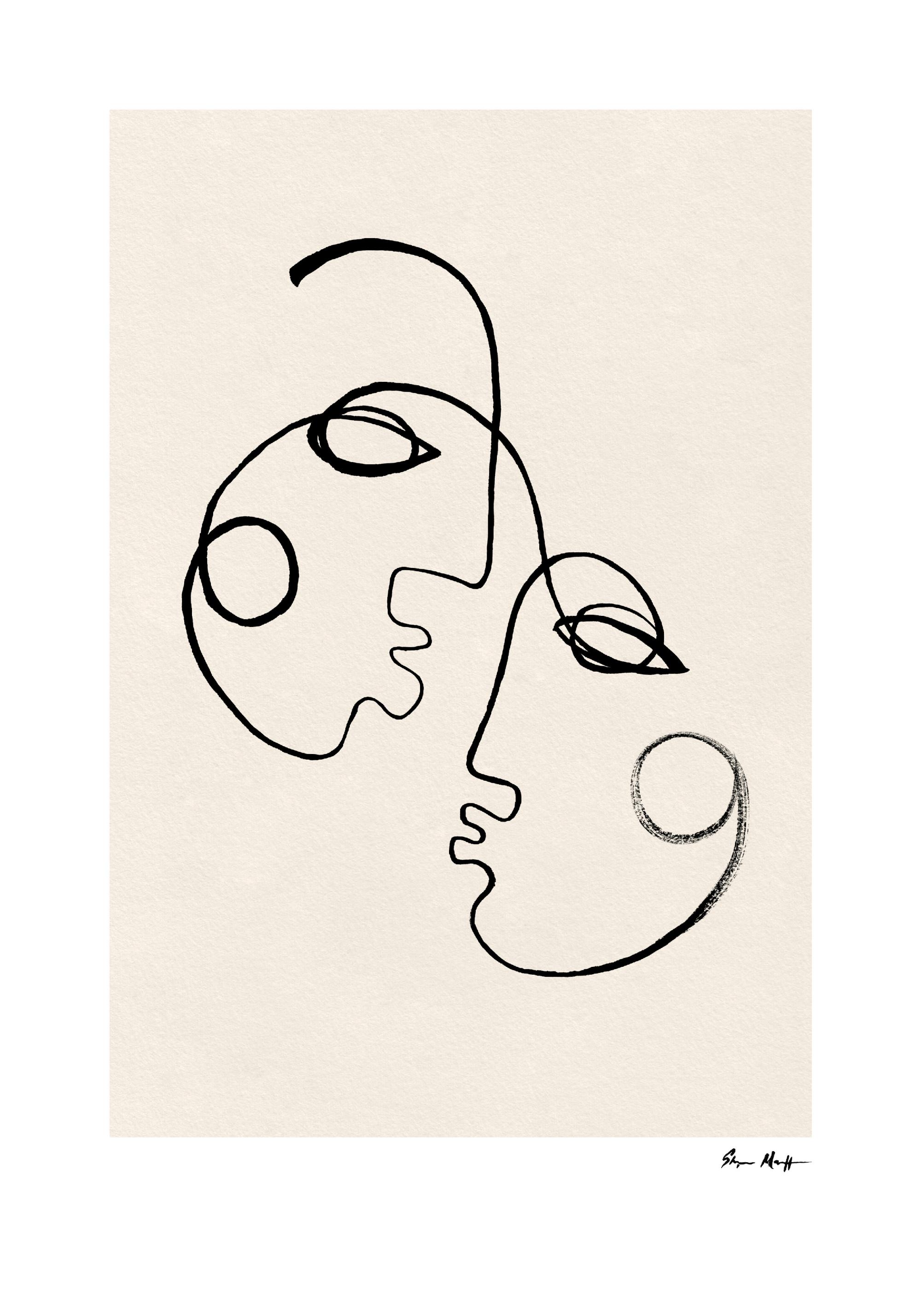 From $31An abstract poster of two faces drawn with a fine black brush stroke on a beige background. The two faces are facing each other and it looks like they are going to kiss.