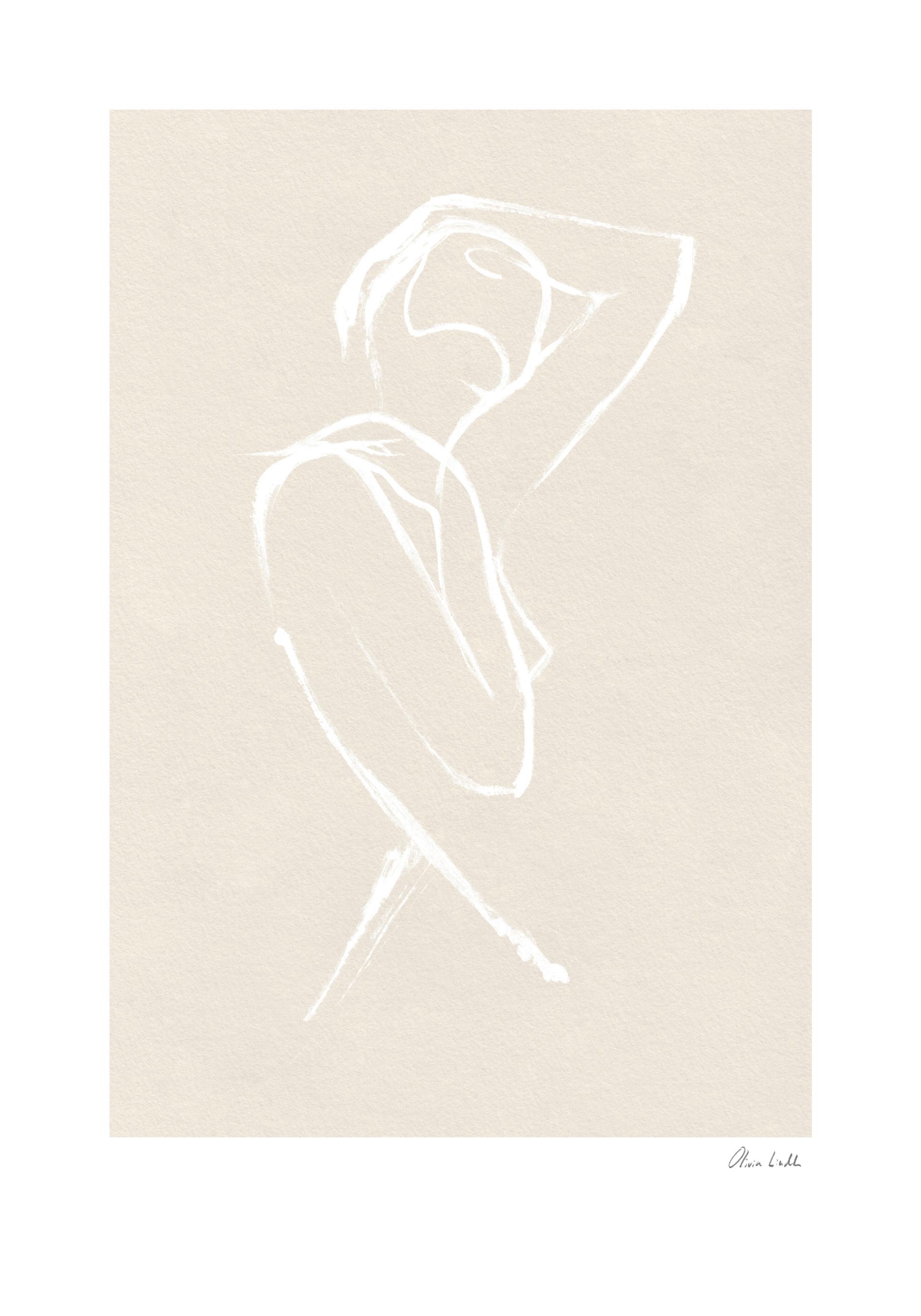 A beautiful abstract poster of a drawing with the picture of a woman, who covers her head with her hand and gently pushes it to the side. The other hand rests on her shoulder. The sketch is drawn in white on a beige background.