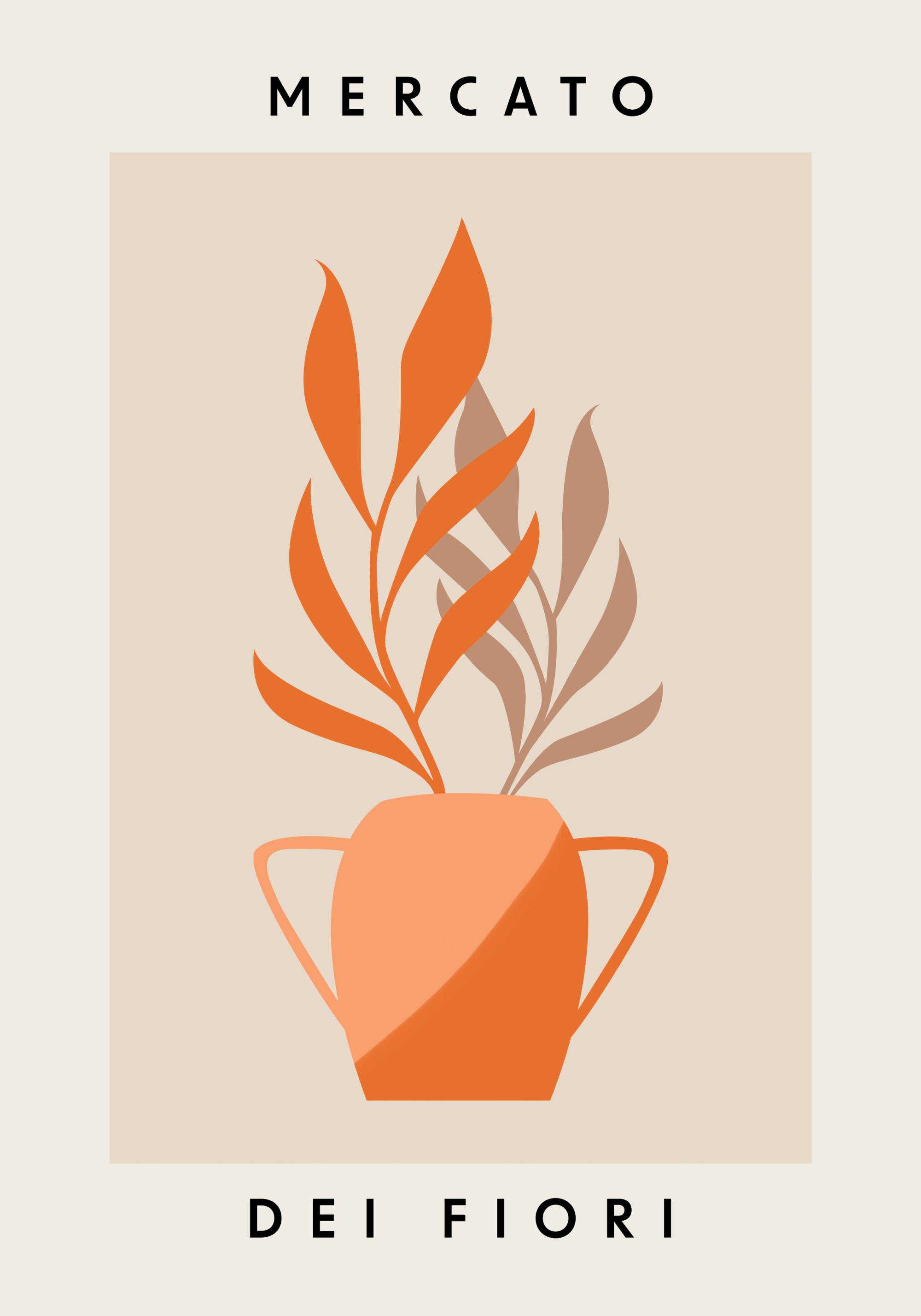 From $31Graphic art print of plants in a flower pot of orange and brown against a beige background. The art print has the text 'Mercato Dei Fiori' in black. Pair this art print up with Mercato No2 Poster to create a modern feel in your home decor.