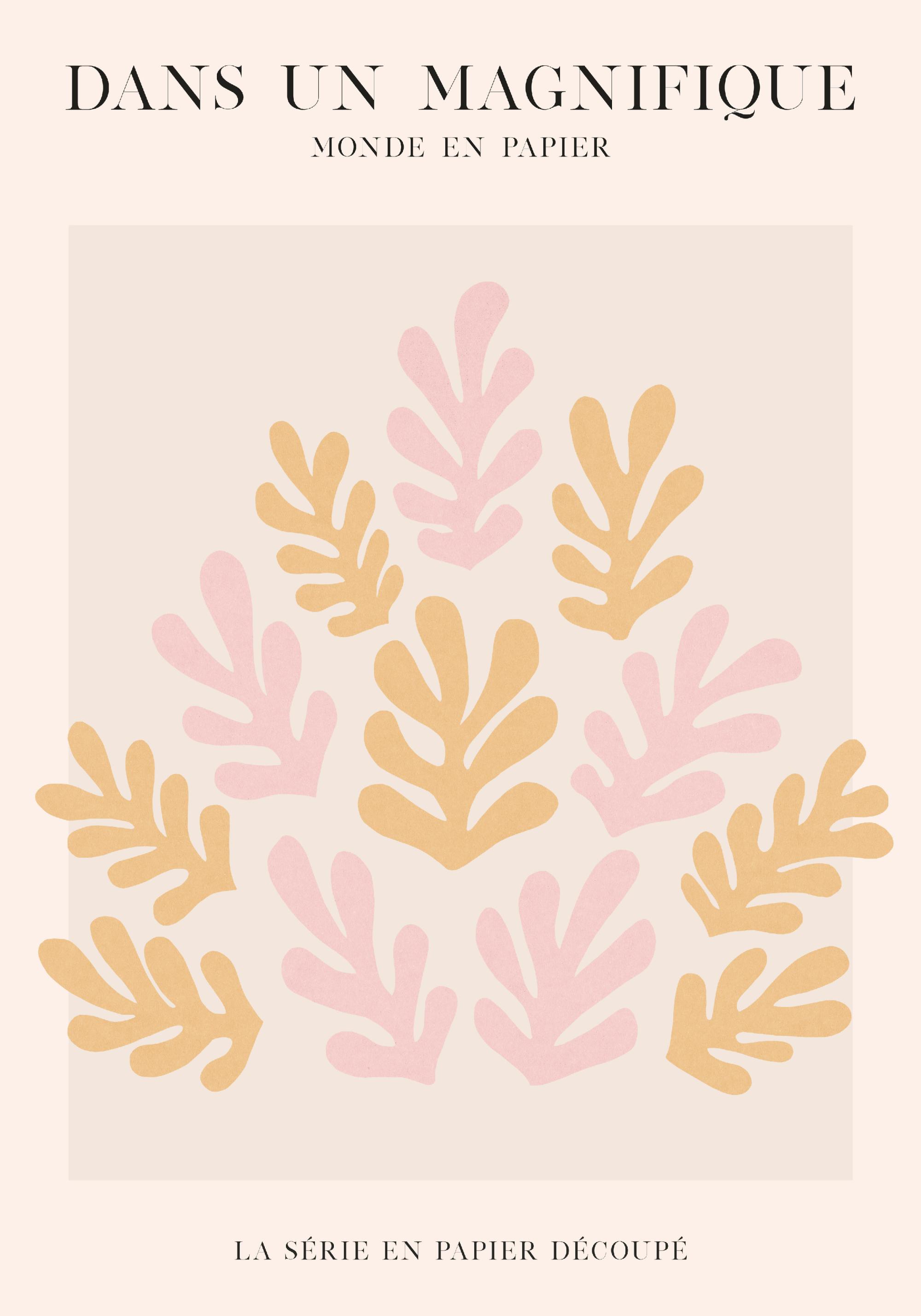 From $31An abstract graphic design poster of pink and orange leaves against a beige rectangle. The illustration includes text at the top and bottom in a beautiful font. Combine this illustration poster with other graphic posters from the Papercut series and give your walls a stylish make-over.