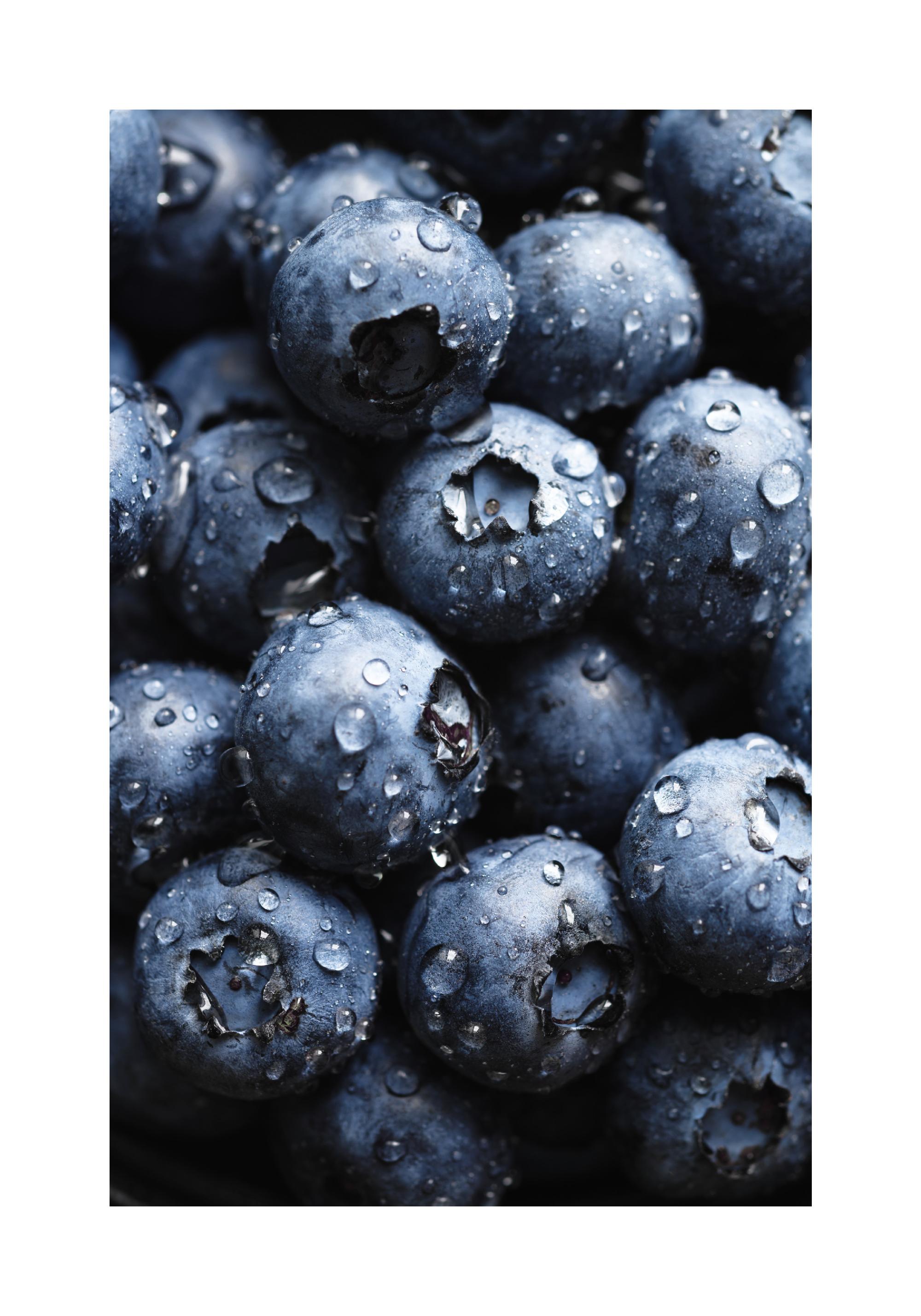 A beautiful kitchen poster of blueberries with drops of water. The great natural blue tone of the blueberries bring life and cheerfulness to your kitchen.