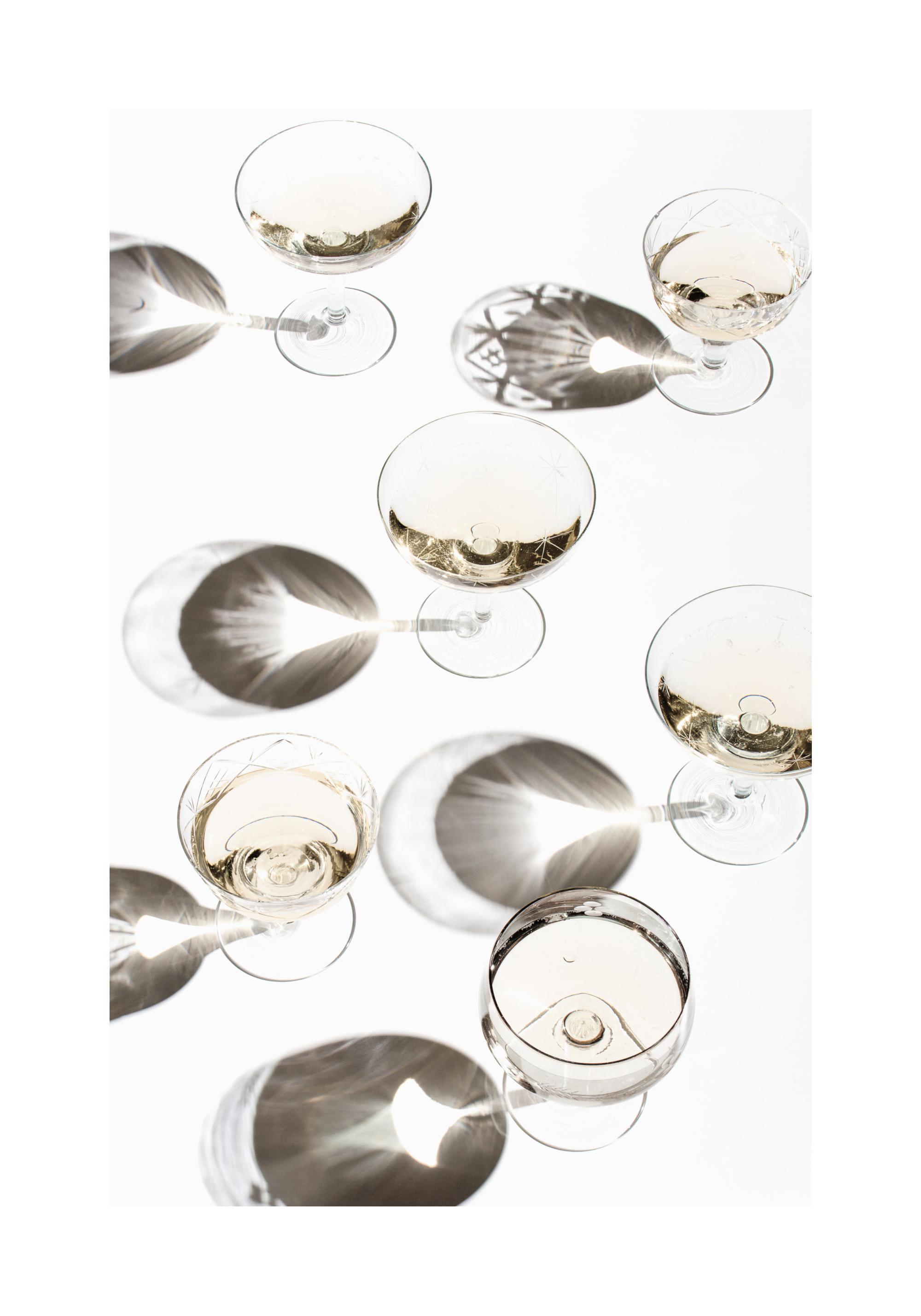 An extravagant champagne poster of filled champagne glasses casting a beautiful shadow on the white background. This photo poster looks great in the kitchen or dining room and brings a touch of glamour and luxury to your home.