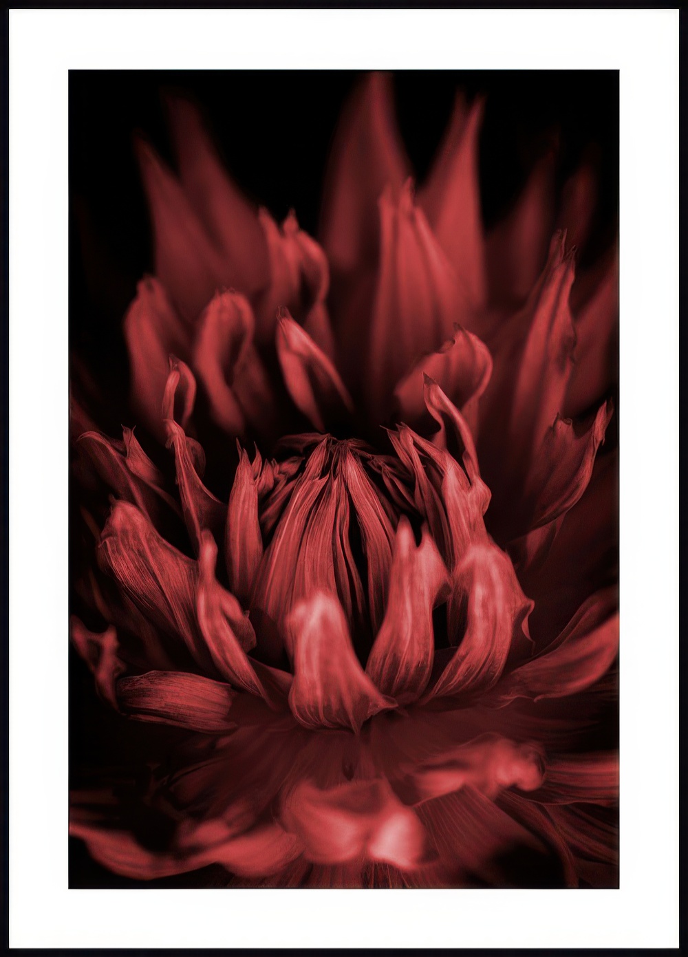 Stunning poster of an intensely blood red dahlia in close-up. The red dahlia symbolises strength and power but the colour red also symbolises passion and love.