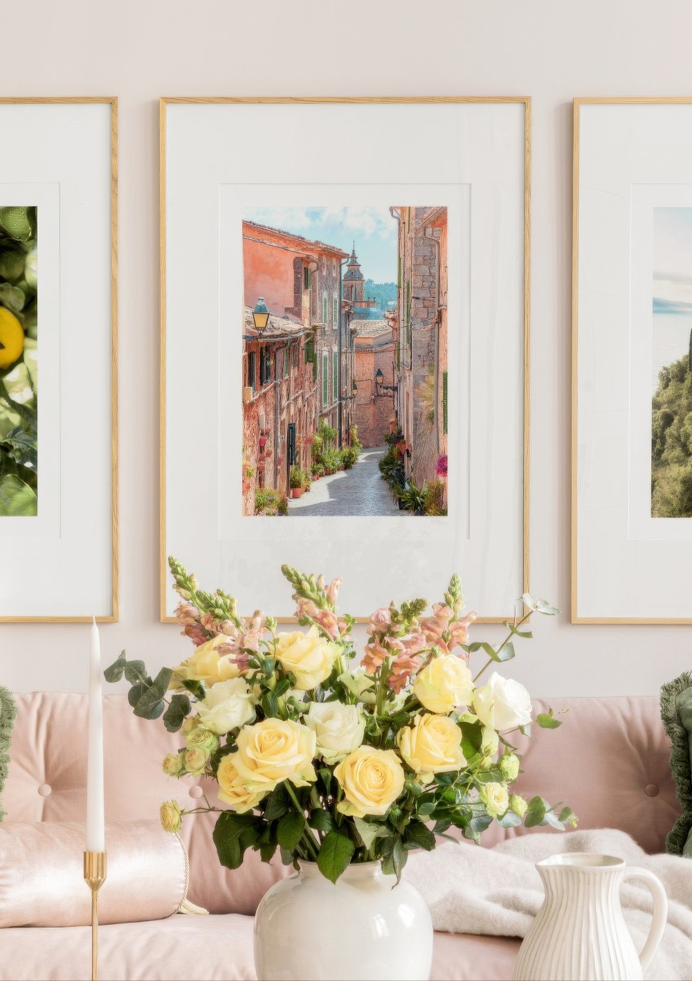 A dreamy photographic poster of the historic town of Valldemossa on the island of Mallorca, Spain. The small mountain village with its terracotta-coloured stone houses and colourful flowers and plants is the perfect place to forget your everyday life and gather new energy. Bring a pleasant holiday feeling into your home and give your home a southern flair.