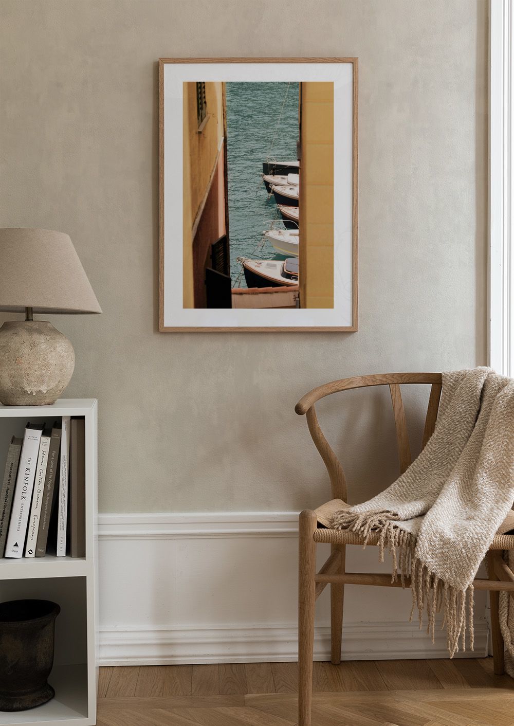 A photo print of four boats docked on calm blue water, framed by tall yellow and brown walls. Perfect for bringing a peaceful coastal vibe to your home.