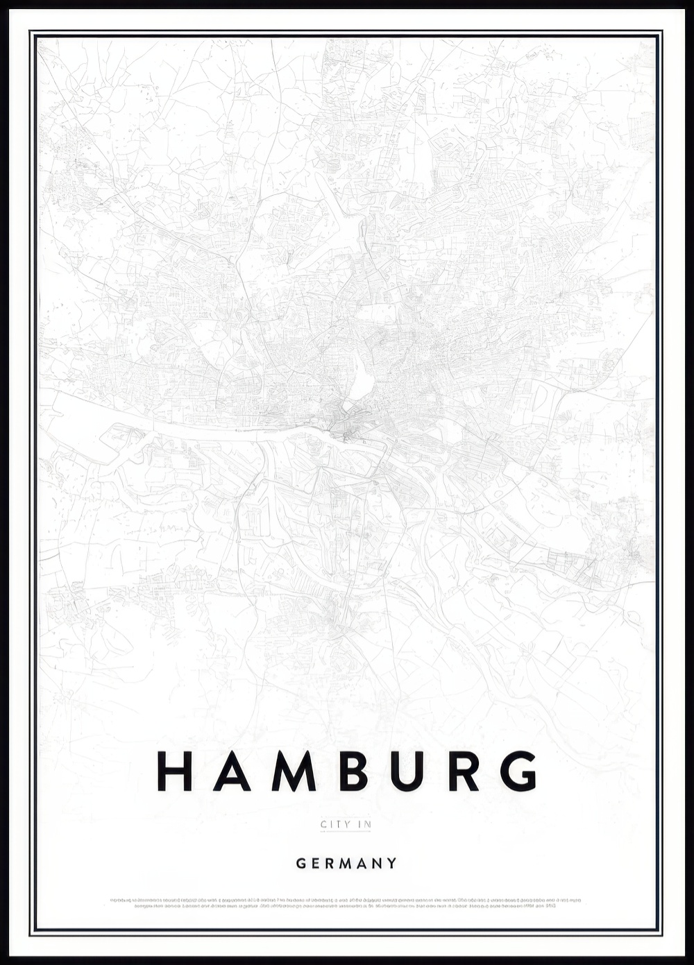 Stylish geographical poster of Germany's second oldest city; Hamburg. The city's name is printed in large capital letters below the image, giving it a modern impression. Did you know that world's largest model railroad is located in Hamburg? At Miniatur Wonderland you can look at the entire world and other landmarks in a 1:87 scale. Doesn't this make you want to visit this incredibly cultural city?