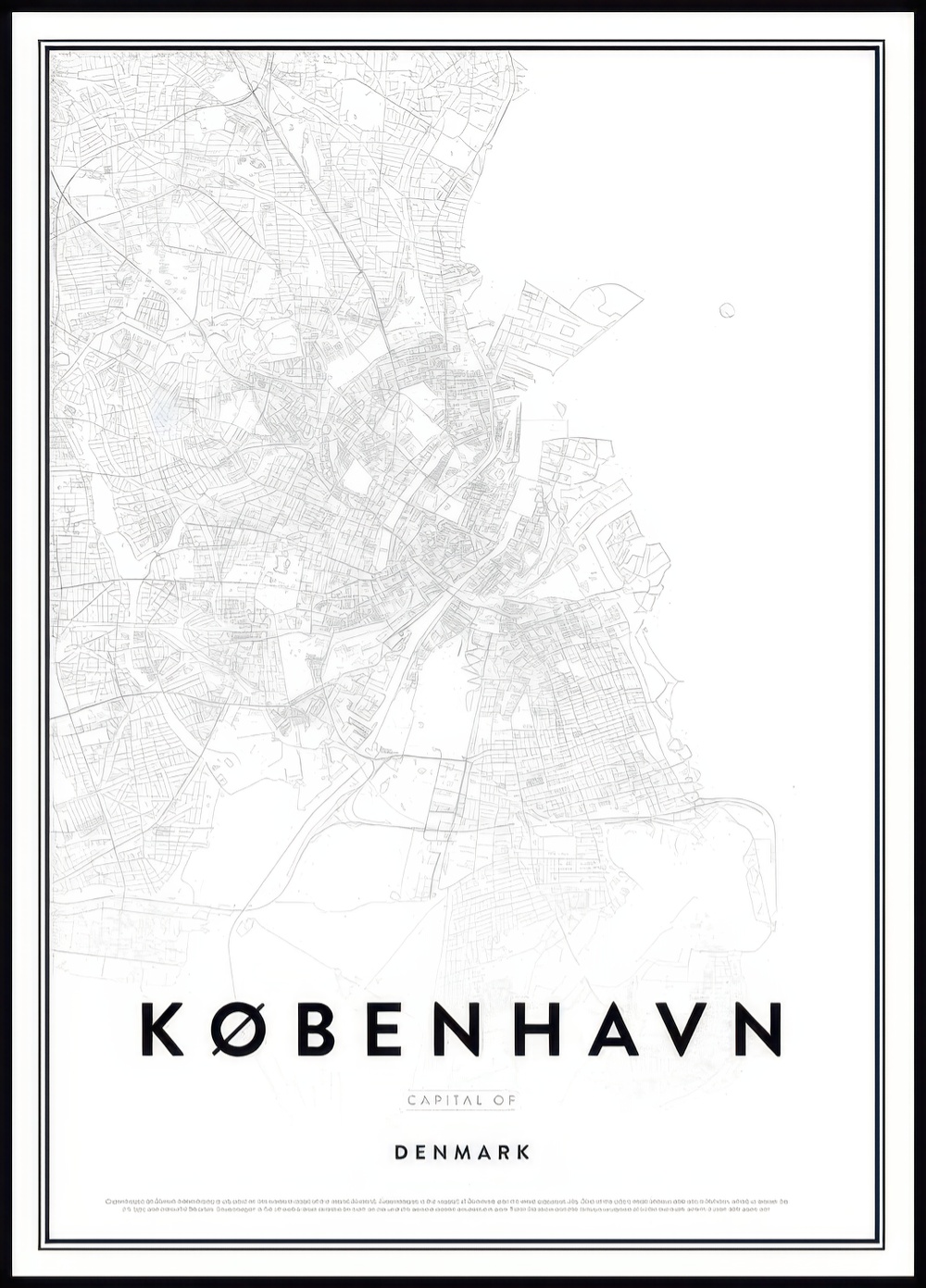 Stylish geographical poster of the Danish capital; Copenhagen. Underneath the minimalistic city map you can see the word København (Copenhagen in Danish), which gives the poster a modern impression. In addition to the colourful facades and stunning architecture, the city is also well known for its picturesque traffic-free streets like Strøget en Nyhavn. Don't forget to pay a visit to the little mermaid's statue when you visit Copenhagen!