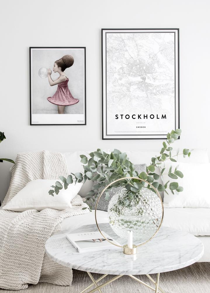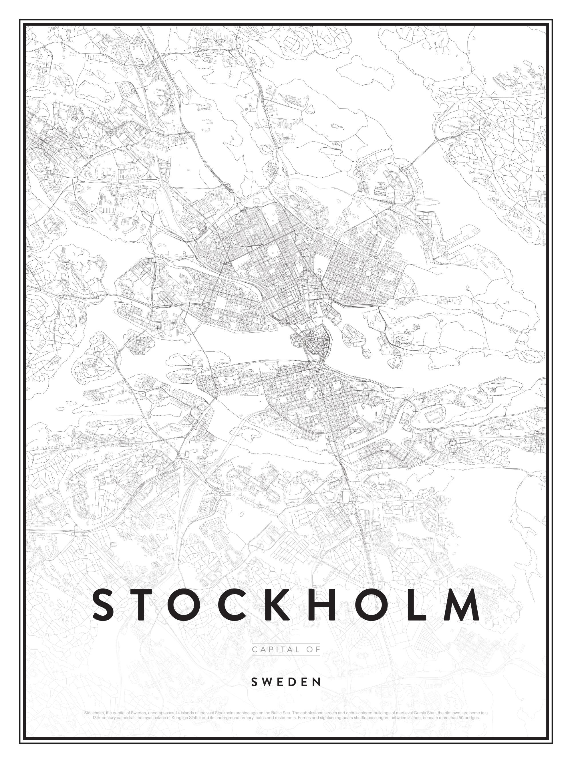 A stylish black and white poster with a map of Stockholm, Sweden This poster will look great in a black or white frame.