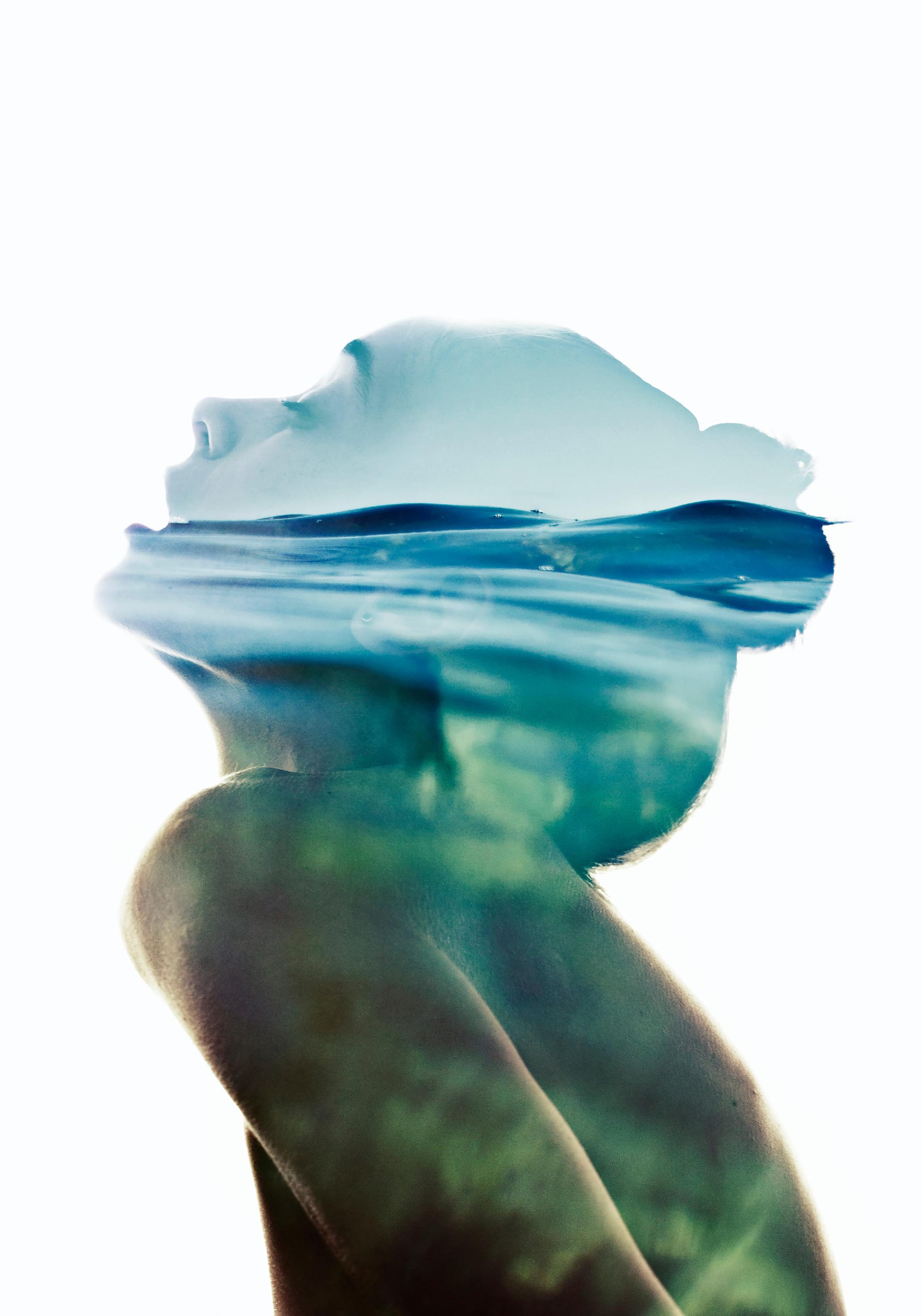 Beautiful photo art by Aneta Ivanova. In this picture you see a woman's silhoutte filled with a beautiful, clear blue/green ocean and a wonderful blue sky. The woman seems to try to keep her head above water. You can interpret this image as the image of being hopeful and melancholic. The saying 'keeping your head above water' means trying to stay out of trouble, or specifically, staying afloat financially.