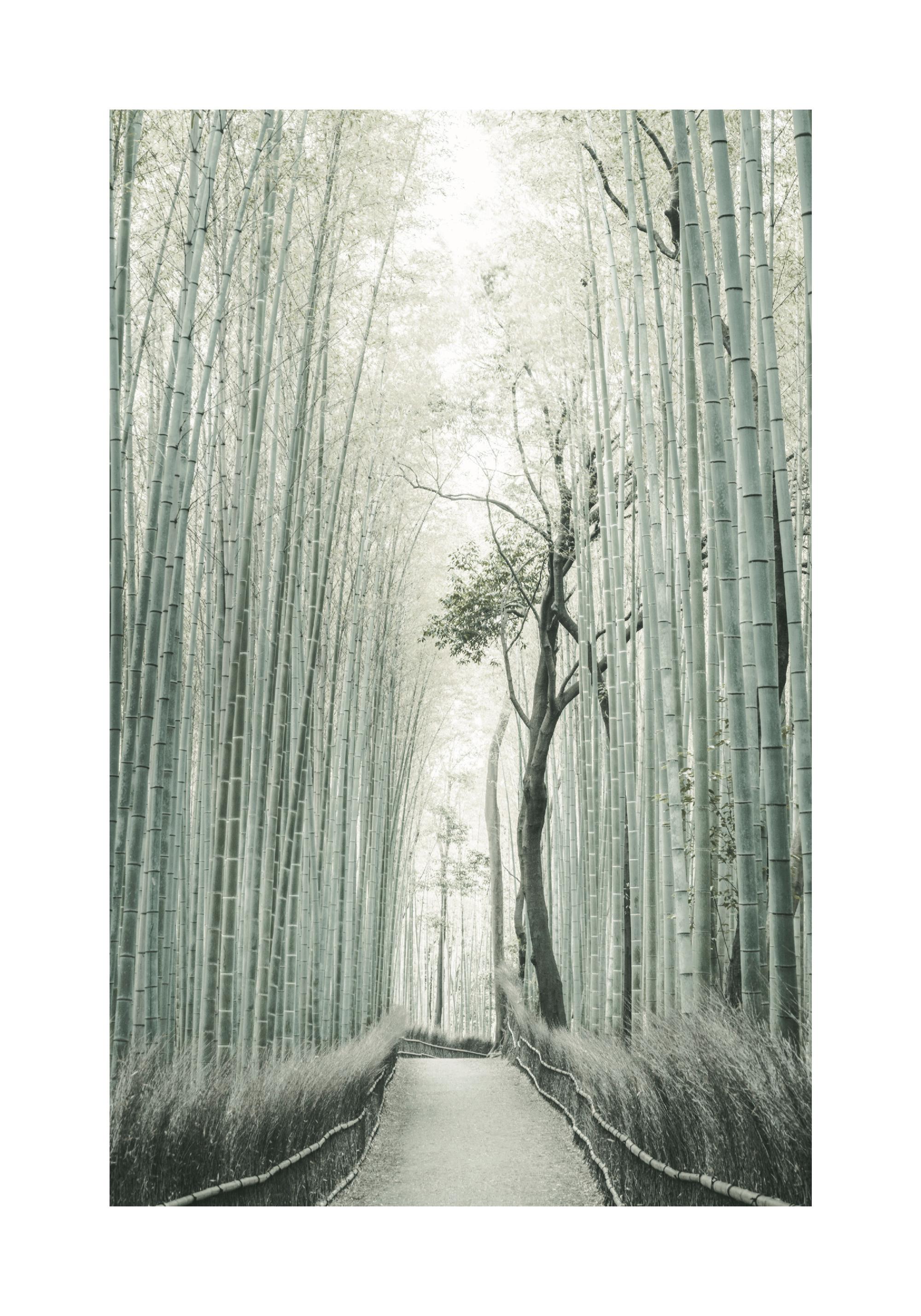Soothing nature poster of a path that leads through a densely vegetated bamboo forest. There are a few other tree species between the bamboo trees that provides a beautiful contrast with the mint green colors. The poster has a printed white margin that frames the design.