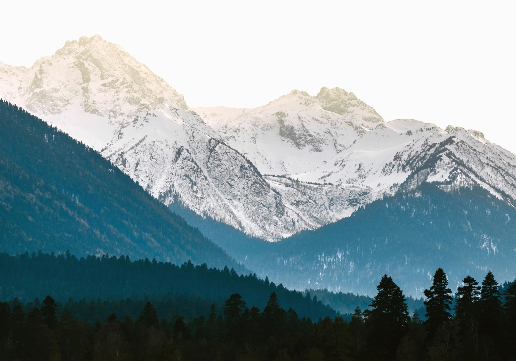 A fascinating landscape poster of a forest and mountain landscape. The light makes the forest glow blue. Blue has a harmonising effect and looks casual and stylish at the same time.