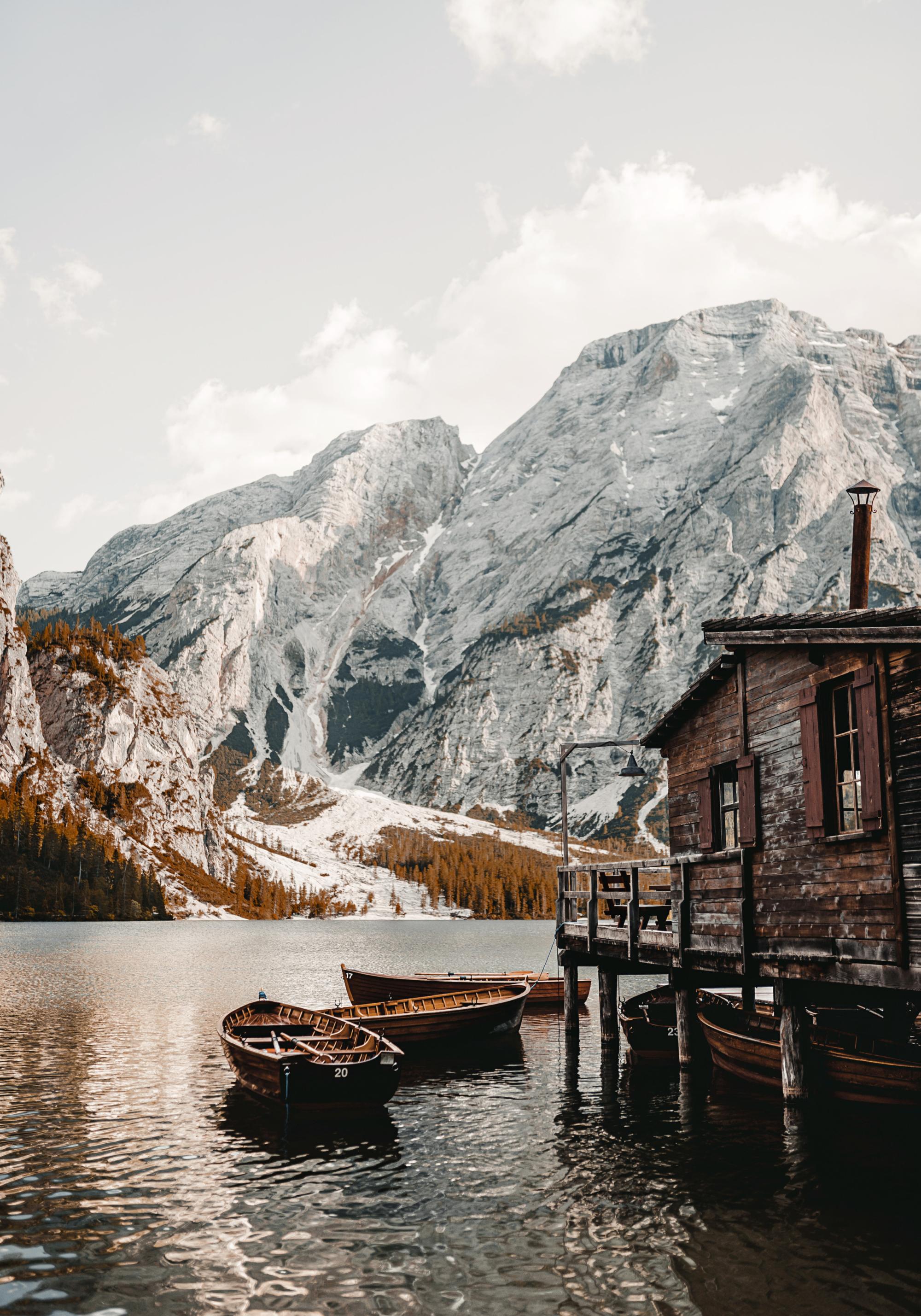 A soothing nature poster of a boathouse at the Braies Lake in Italy. Three boats lay in the quiet lake and in the background snow-covered mountains can be seen. The breathtaking natural scenery with the different shades of red, white, brown and grey are a great eye-catcher for your walls.