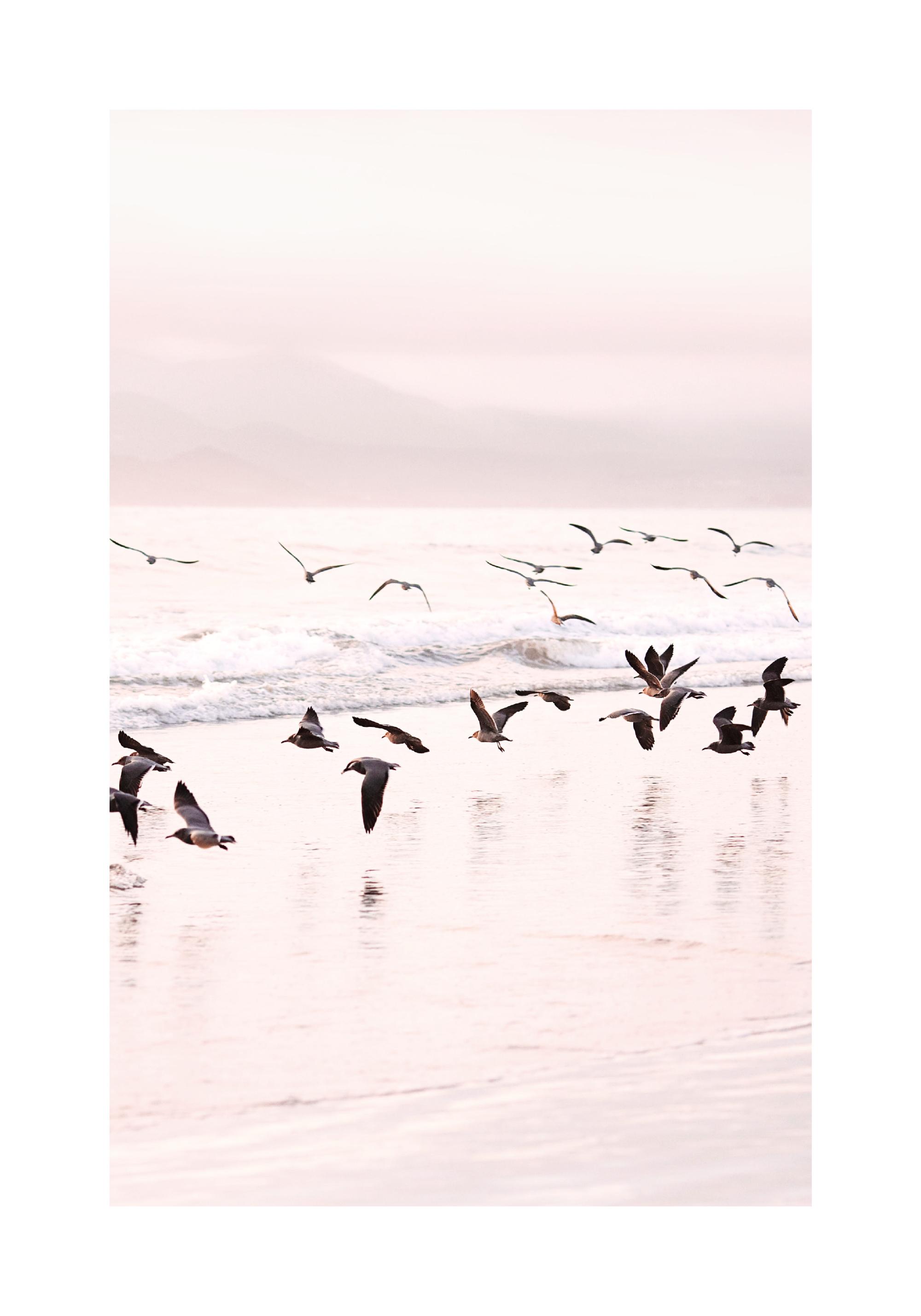 From $31A calming nature poster of a flock of birds flying over the beach and sea with a pink sky. The nature print in pastel colours creates harmony and a touch of romance in your home.
