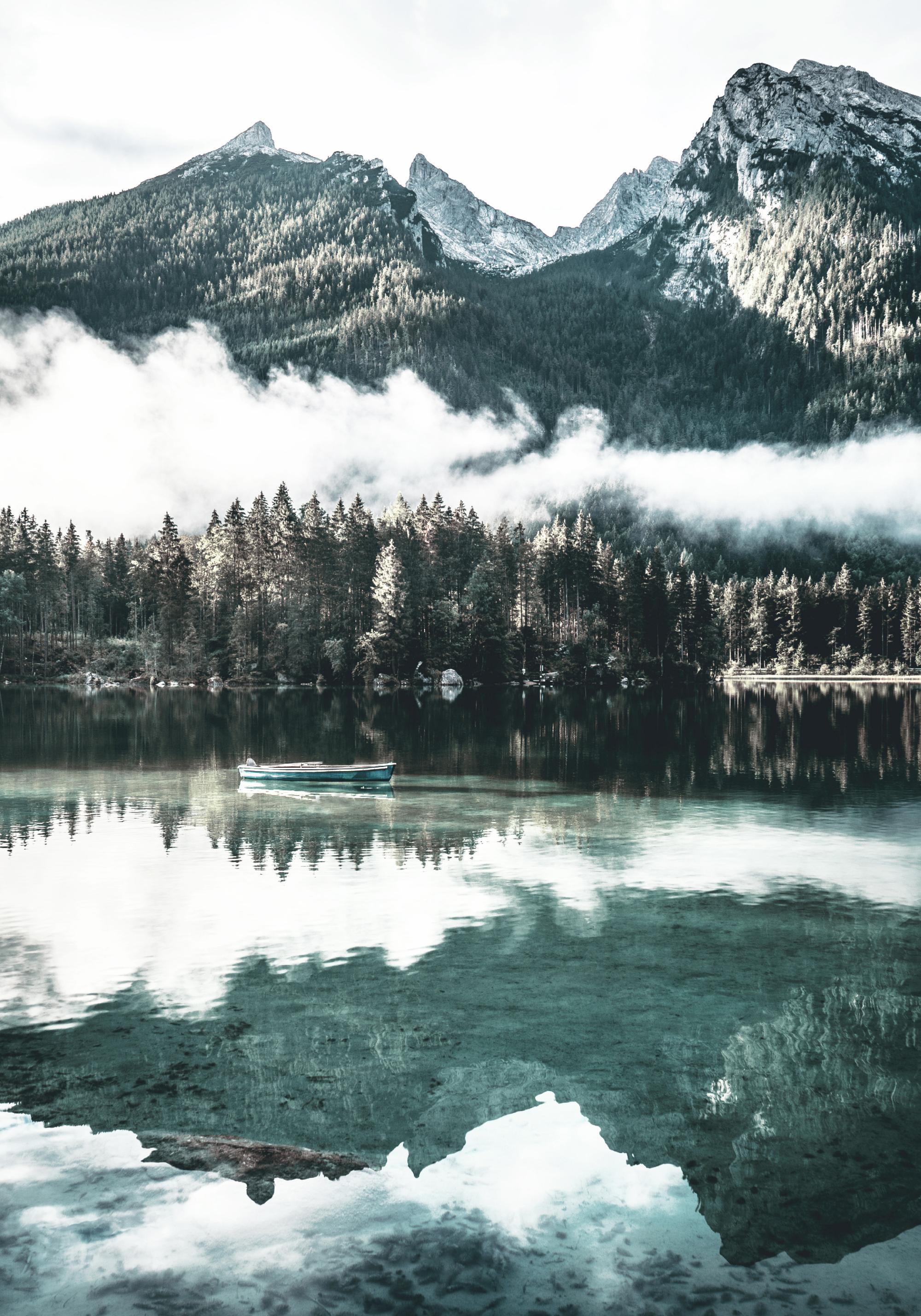 From $31A calming landscape print of a forest lake in which the clouds, mountains and trees are reflected. In the background are mountains covered by trees and a cloud cover hanging over the fir forest. This nature poster radiates peace in any room and suits both modern and classic interior styles.
