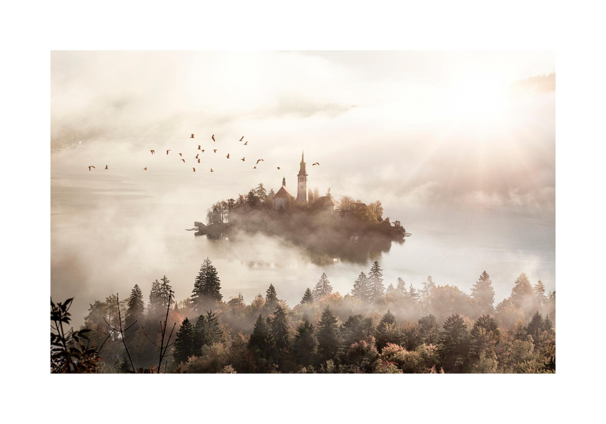 An impressive landscape poster. The sun shines through the clouds and makes the colours of the forest shine through. Clouds hang over the lake and the treetops and give the poster a magical and mysterious feel.