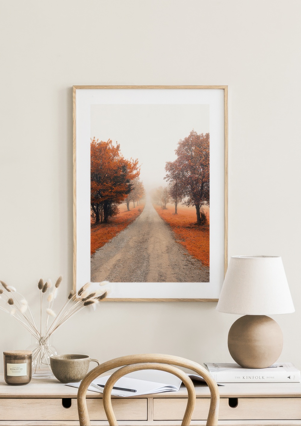 From $31Brown and orange misty alley tree poster! Let's create a warm and calm feel in your home with this print inspired by the autumn. The perfect print to add to the living room or bedroom.