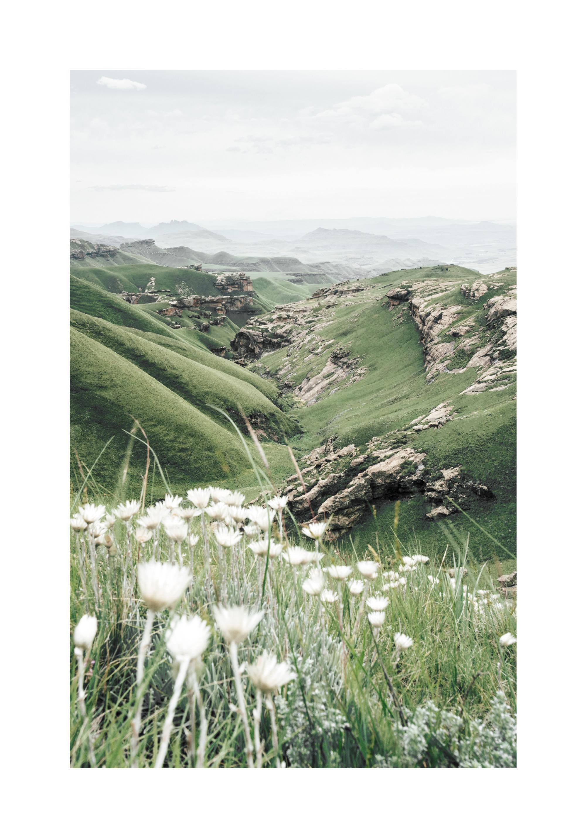 From $31A wonderful landscape poster of a green mountain valley and white flowers. The white flowers form a nice contrast to the mountains covered with green grass. The hilly landscape stretches as far as the eye can see and arouses the urge to discover the world.