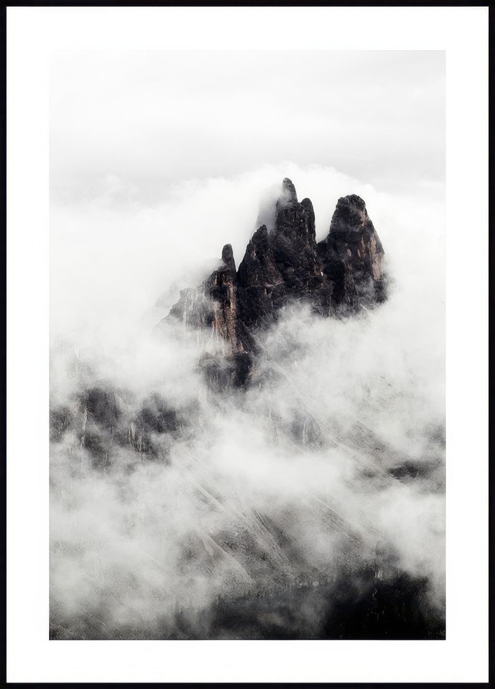 Beautiful nature poster of a mountaintop that reach above the clouds. The beautiful view has a mysterious atmosphere and screams to the adventurer inside you. The poster has a printed white margin that frames the design.