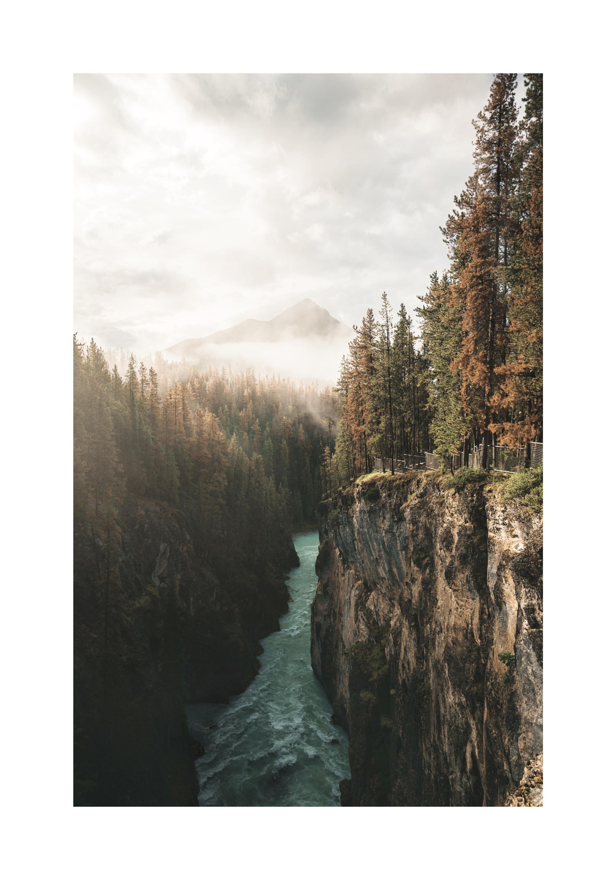 A magical nature poster of a sunrise over a river. The sky is covered with clouds and the sun shines on the densely overgrown forest and makes the green and orange leaves and fir needle glow.