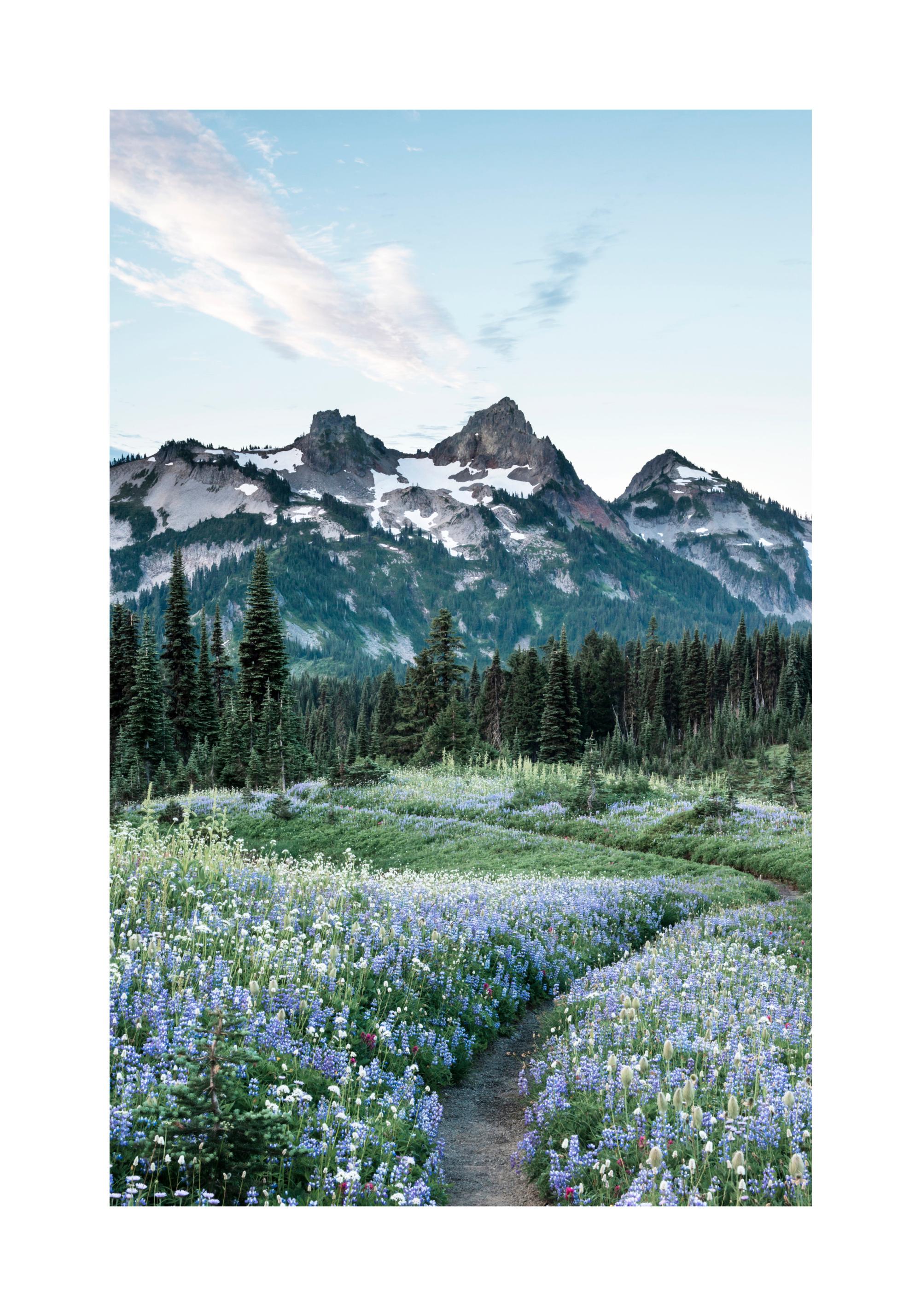 Pretty landscape poster that takes the viewer on a hike through a wildflower meadow with lots of blue, white and red wildflowers and leads him through a densely overgrown forest. Behind the forest, the hike goes up steep mountains until the viewer arrives at the snow-capped mountain peak.