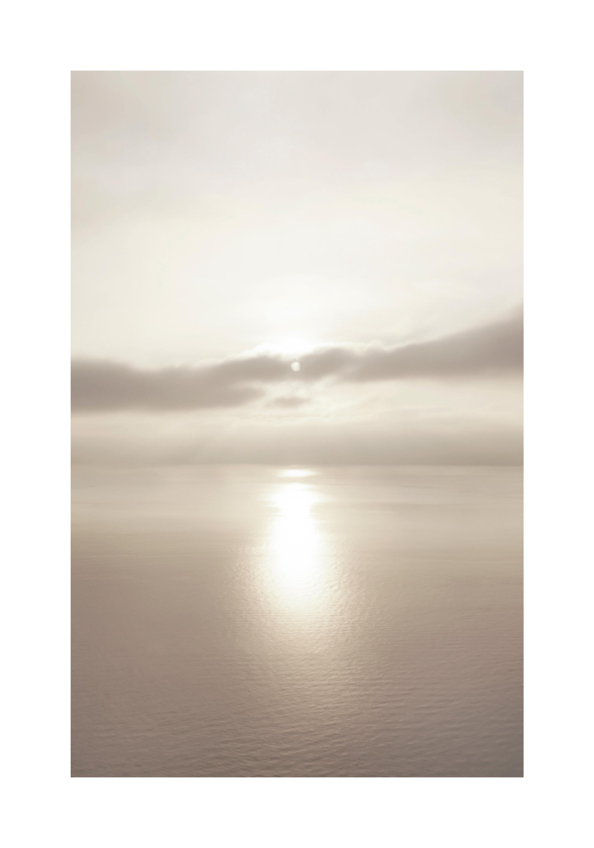 A soothing nature poster of a sunset by the sea. The sun is hidden behind the clouds and goes down towards the horizon. The sunlight is reflected on the calm sea and seduces the viewer to dream.