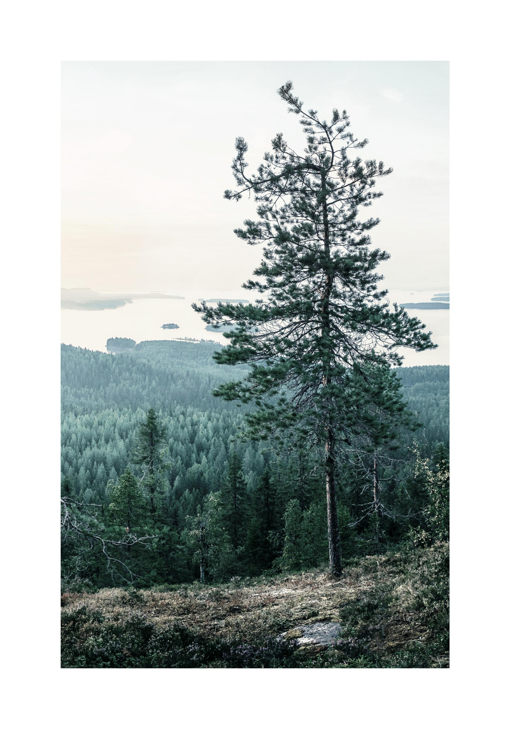 A beautiful nature poster of a tree on top of a mountain with a forest landscape and water in the background. Breathe in the forest scent and enjoy this breathtaking view of the mysterious forest.