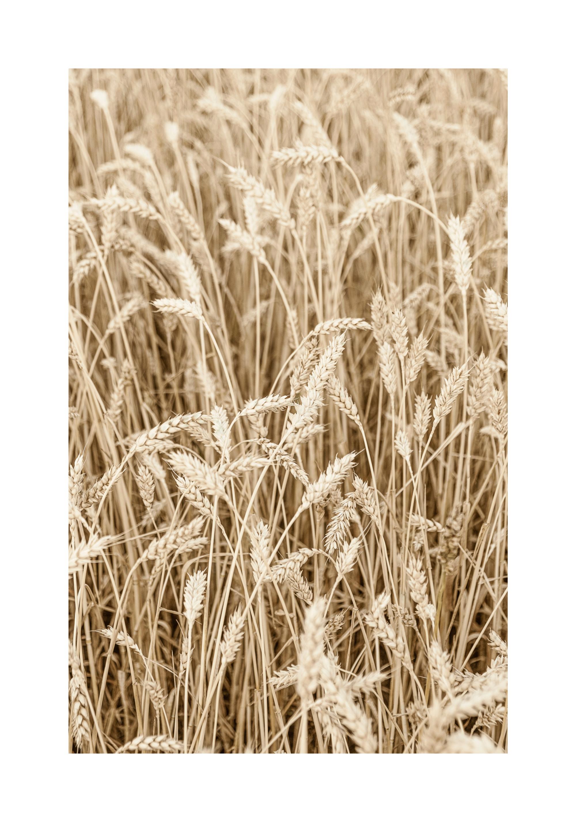 A beautiful nature poster of a wheatfield in summer. The field glows golden in the summer light and when looking at this photo poster you can almost hear the soft rustling of the wheat grasses. Decorate with grasses for natural accents and a summery look!