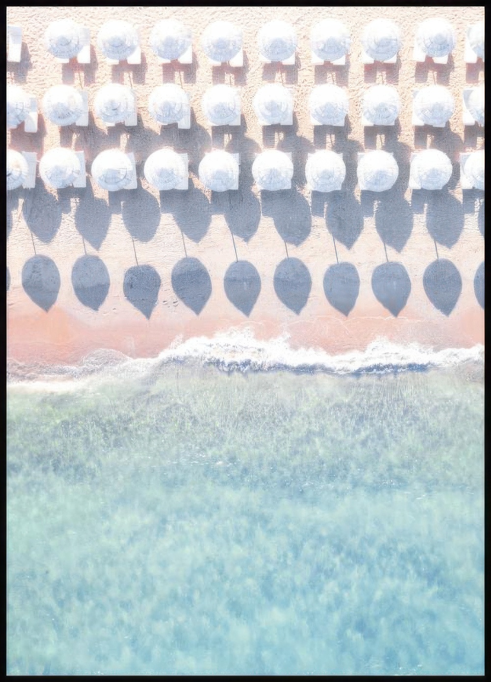 From $31This image shows a beautiful white sandy beach with perfectly placed beach umbrellas. The clear blue water almost reaches to the umbrellas' shadows. This poster screams sun, sea and beach! The stunning pastel colours are perfect to create happiness and fun in your home. Invite summer into your house all year and combine this poster with our other tropically tinted posters.