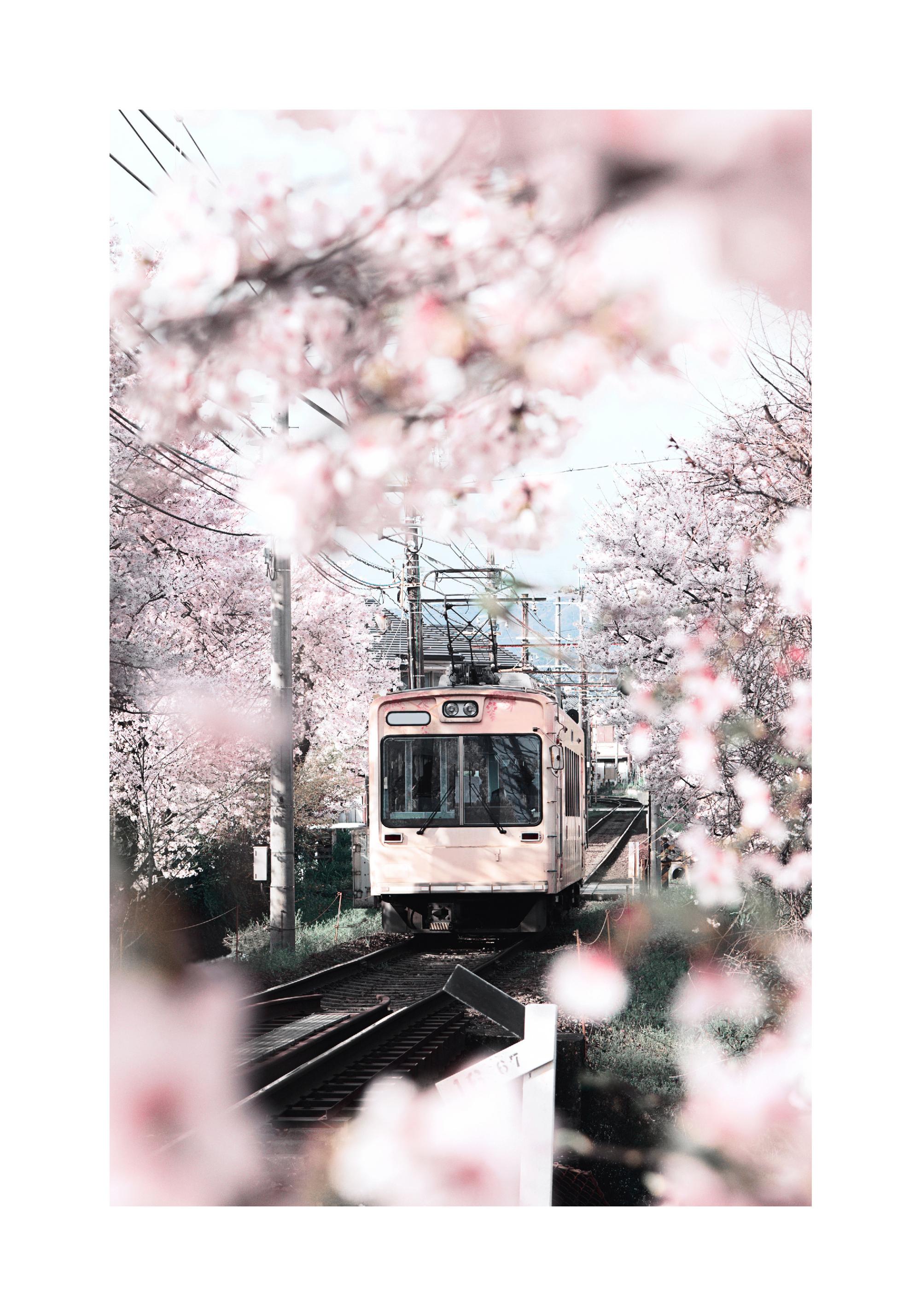 A pink photographic print of a pink train passing through the Japanese city of Kyoto and blossoming pink cherry trees. In Japan, the cherry blossom (in Japanese 'Sakura') is a traditional symbol of the beginning of spring and a highlight for the Japanese. Bring the pink sea of flowers into your home and let spring move in.