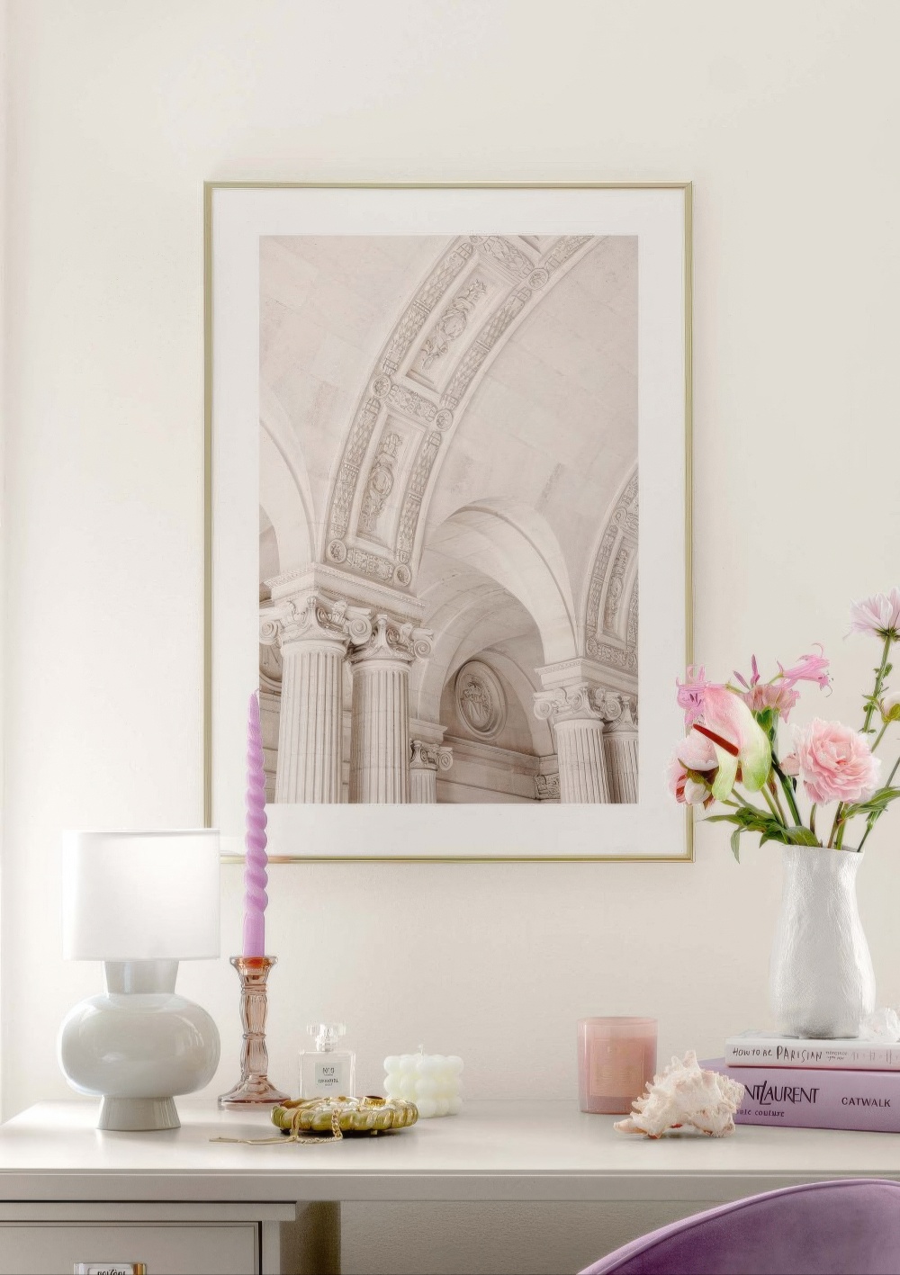 Photograph of elegant pillars in beige with an amazing structure. Create an elegant and soft gallery wall with this beige art print.