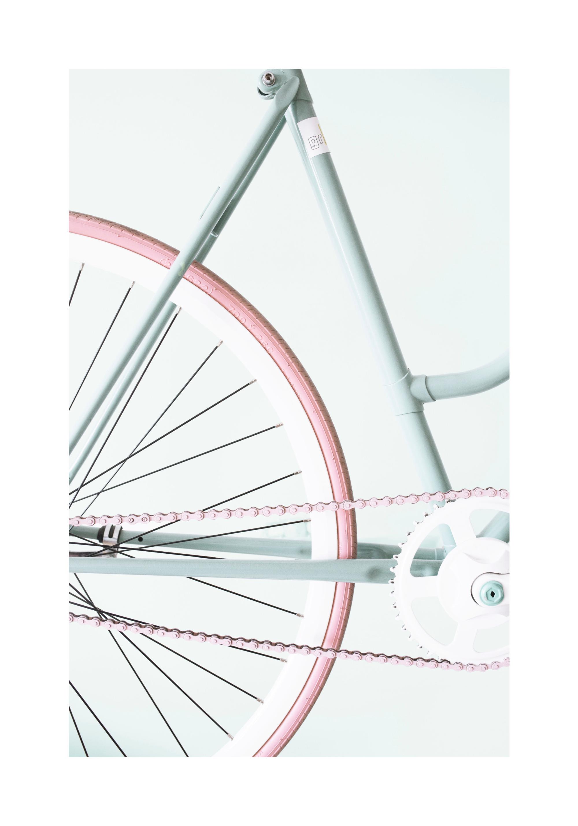 A stylish photo poster of a light blue bike with a pink tyre against a light blue background. This retro bike in pastel colours is a real eye-catcher and brings a trendy, as well as retro touch into your home.